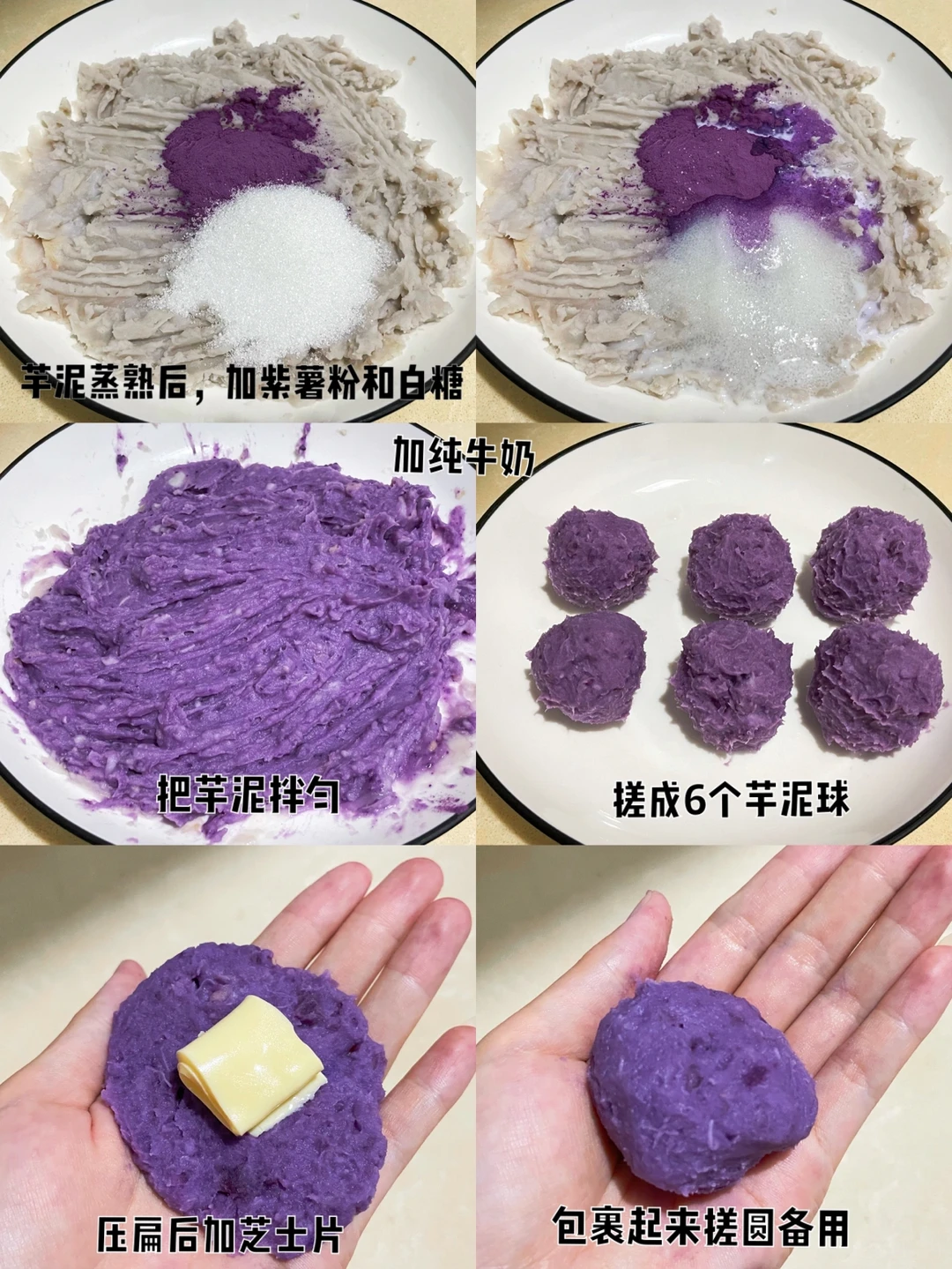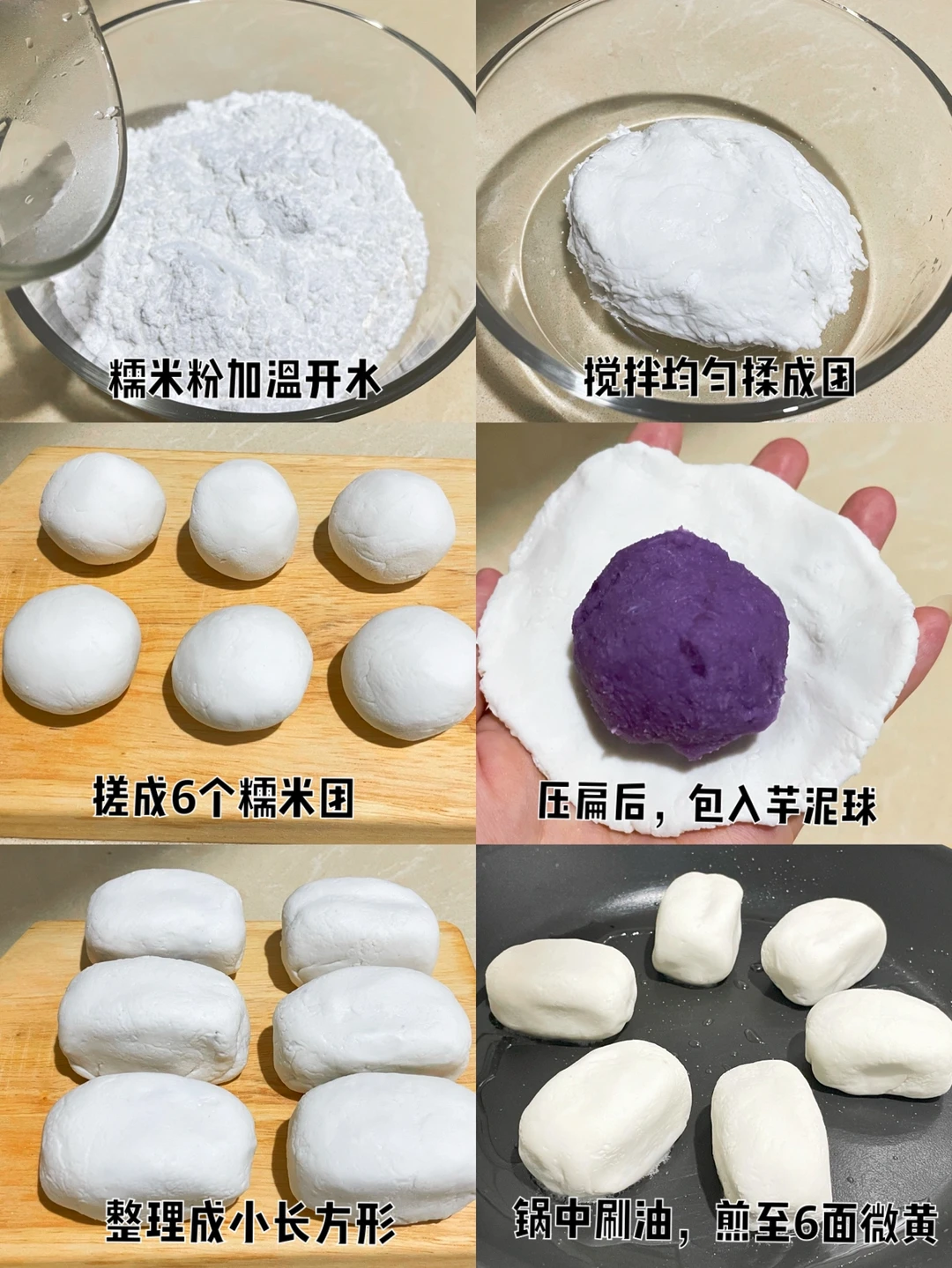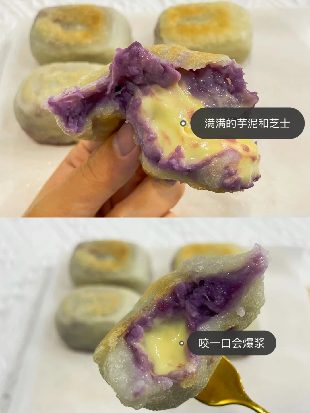 [吐舌头H]芋泥控们看过来啦❗️芋泥芝士爆浆年糕----芋泥和芝士简直神仙搭配,口感绵密,软糯香甜,一口爆浆,🈵️满的幸福感❗️ ✨做法超简单,平底锅就能搞定,喜欢的赶紧去试试~ 🌈做法: 1⃣️芋头150g+紫薯粉3g+白糖15g+牛奶5g,把芋泥拌匀。 2⃣️把芋泥搓成6个芋泥球,压扁后加芝士片。 3⃣️糯米粉120g+90g温开水,搅拌均匀揉成面团。 4⃣️分成6个糯米团,压扁包入芋泥球,整理成小长方形。 5⃣️平底锅刷油,小火煎至六面金黄即可出锅。