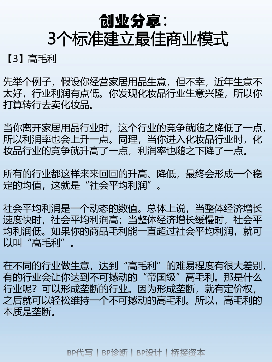 最后一个是高毛利,也就是说你的产品或服务的成本相对较低,但能够以高价卖出,从而获得可观的利润。比如奢侈品、高端科技产品,这些东西的利润率往往很高。