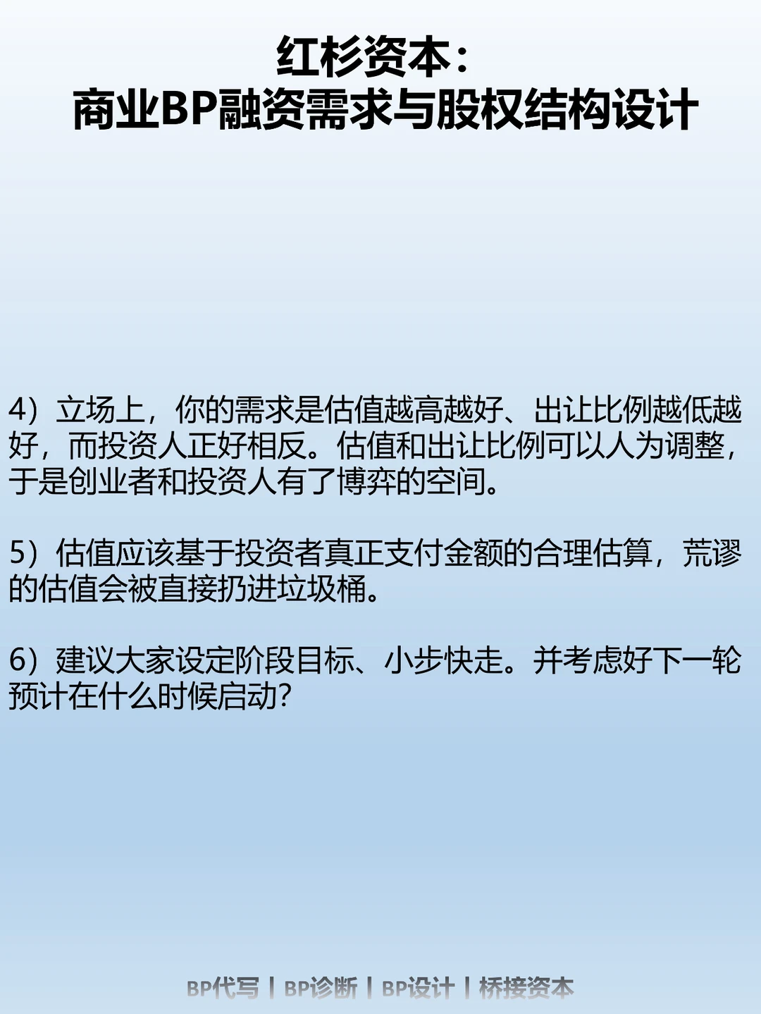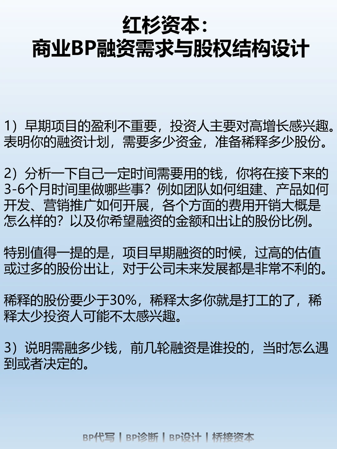 1)早期项目的盈利不重要,投资人主要对高增长感兴趣。表明你的融资计划,需要多少资金,准备稀释多少股份。