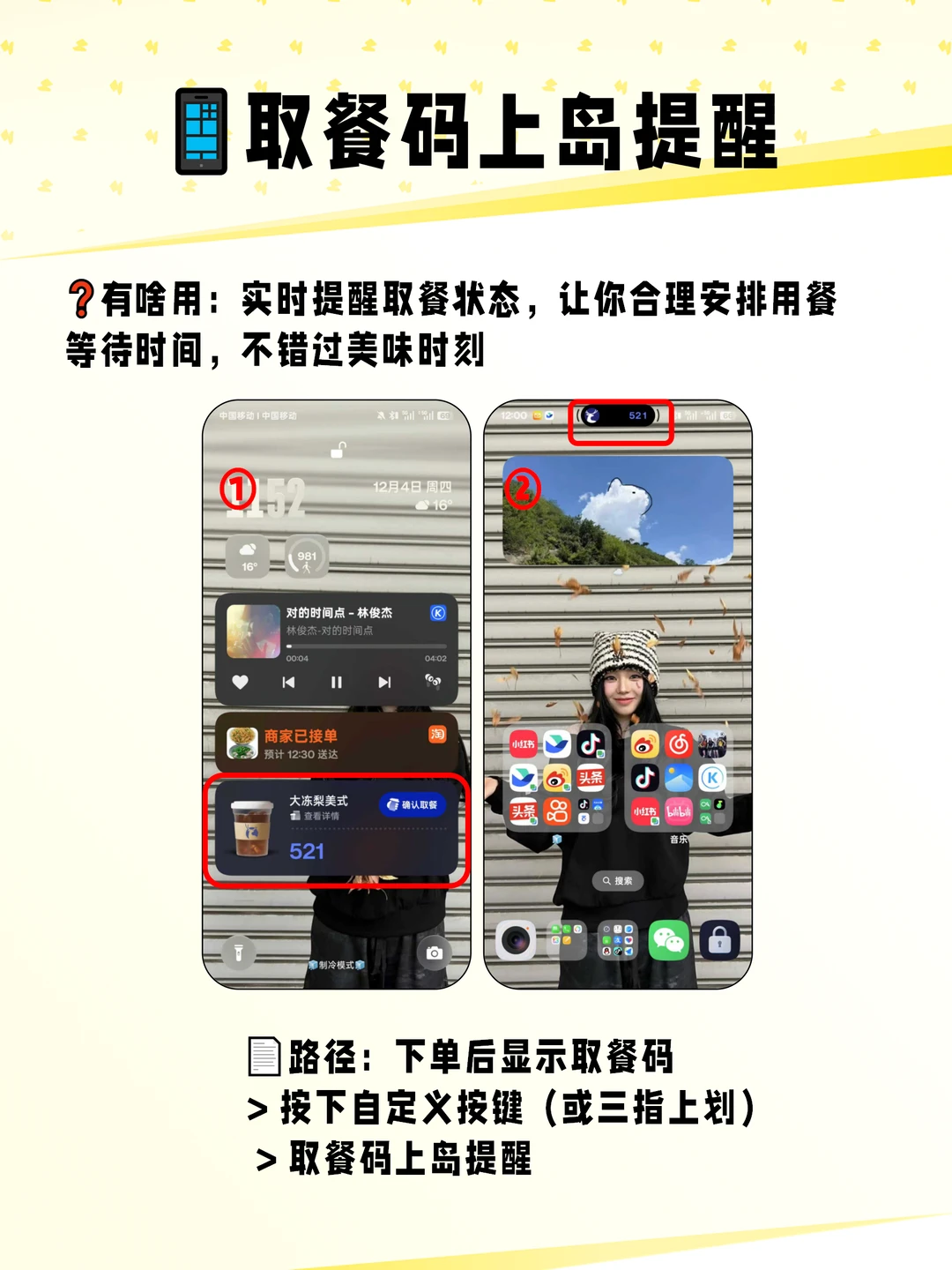 ✍🏻路径:下单后显示取餐码 > 按下自定义按键(或三指上划) > 取餐码上岛提醒