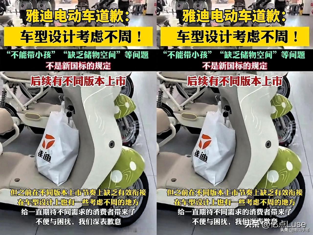不出所料,雅迪政治觉悟就是高! 此前便有高人预测,雅迪会出来道歉,称自己没理解文件要求,今日道歉声明果然发布。 此次声明中,雅迪未甩锅,主动承认自身对新国标理解不准、版本衔接脱节的问题,还诚恳向消费者致歉,没让舆论跑偏至质疑政策,难怪大家都夸雅迪能处,有事真扛。 雅迪此次道歉并非喊口号,后续还会推出各类车型。明确12月底前上架亲子版电动车,补全带娃、储物等实用功能,甚至为买错车的用户提供折价换购福利。 雅迪“不硬杠、快整改、担责任”的态度,正是企业政治觉悟的体现!