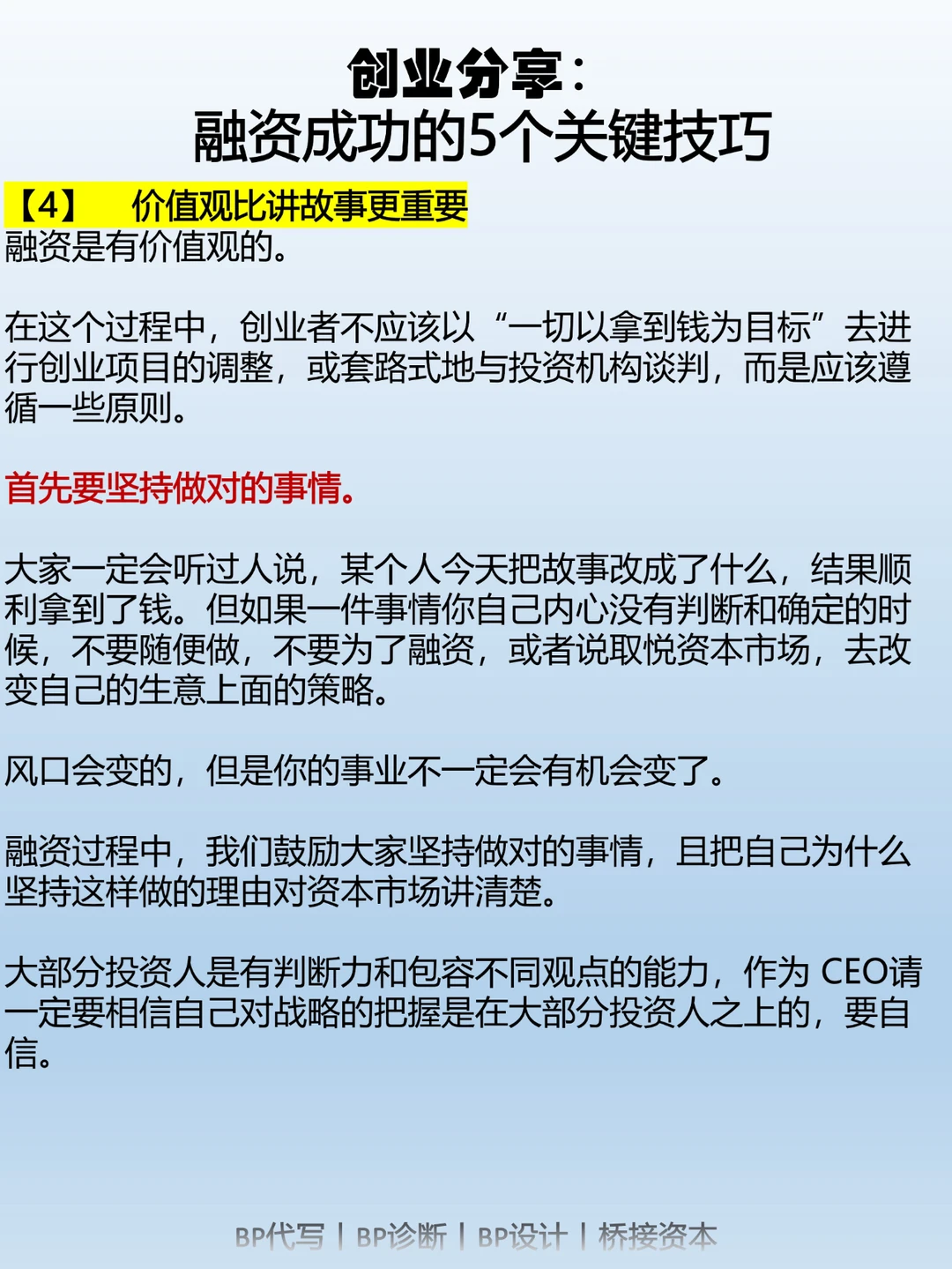 第四,价值观比讲故事更重要。当你跟投资人交流时,展示你的核心价值观和团队文化是至关重要的。投资人更关注你的价值观是否与他们相符,因为这关系到你们未来的合作和发展。