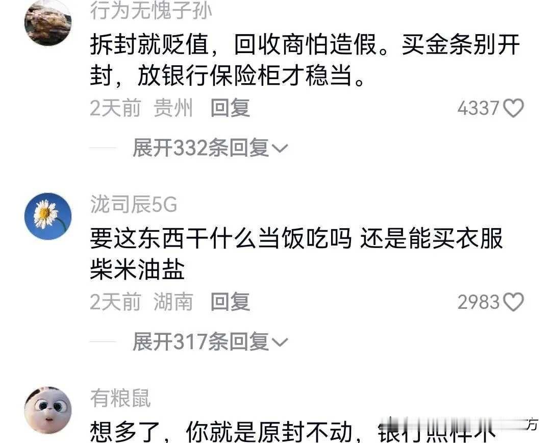 485元买的金条涨到800元, 她去变现时却傻了! 黄金投资的坑,远比你想的多 两年前听银行姐姐建议,485元/克囤了100克金条;两年后金价飙到800元/克,账面净赚31500元——这本该是个完美的投资逆袭故事,可当网友兴冲冲去变现时,现实却给了她一记响亮的耳光。 2023年,国际金价处于阶段性低点,银行工作的姐姐凭着“专业嗅觉”,力劝妹妹把积蓄换成金条。尽管485元/克的价格在普通人眼里已不算低,但姐姐笃定金价还会涨。妹妹半信半疑买下100克,没想到真押中了“黄金牛市”,短短两年金价冲破800元大关,金条成了她眼里“会下金蛋的鹅”。 可当她揣着金条重返当初购买的银行,却被泼了盆冷水:银行明确拒收。明明是自家卖出的金条,为何不给回收?柜员的答复让她瞬间懵了——“塑封膜拆了就视同流通品,我们只收未拆封、证书齐全的原厂包装”。原来她当初好奇拆开看了一眼,这道小小的“开封痕迹”,竟成了变现的第一道拦路虎。 无奈之下,她转向街头挂着“高价回收黄金”的金店,结果发现这里的套路更深。金店给出的报价直接大跳水:拆封金条仅700元/克,原封的也才750元/克,要是被认定为“旧款”,还得再扣40元/克的“款式折旧费”。层层压价下来,原本3万多的预期收益,硬生生缩水近一半,让她心力交瘁。 这起真实案例,撕开了黄金投资的“遮羞布”:很多人只看到金价上涨的红利,却压根没摸清变现的门道。银行回收的苛刻要求(原厂包装、完整证书、无划痕),几乎把普通投资者的变现路堵死;而民间金店的“高价回收”,不过是吸引客源的噱头,实际报价里藏着各种隐性扣费。 网友们对此炸开了锅:有人直言“黄金不能当饭吃,普通人投资纯属折腾”;有人点破关键“回收商怕开封金条造假,买了千万别拆封,最好存银行保险柜”;还有人吐槽“国内黄金市场和国际脱节,再涨价也难真正赚到钱”。 事实上,黄金作为传统避险资产,在通胀、经济动荡时确实能对冲风险,2023-2025年的金价暴涨也让少数人赚得盆满钵满。但它的投资风险,远比收益更值得警惕: 其一,流动性陷阱。黄金本身不产生利息、分红,收益全靠价格上涨,可一旦需要变现,就会面临银行拒收、金店压价的窘境,账面盈利未必能落袋为安; 其二,市场波动风险。金价受全球经济、地缘政治、货币政策等多重因素影响,暴涨之后可能迎来暴跌,盲目追高极易被“套牢”; 其三,认知误区。有人轻信“黄金稳赚不赔”,却忽略了不同渠道的交易规则,比如银行金条和首饰金的回收标准天差地别,限量版金条的收藏属性远大于投资属性,普通人根本没渠道变现。 更离谱的是,文中还出现了脱离普通人实际的“投资建议”——“有余力可配置10公斤黄金,资金不宽裕买1000克也差不多”。要知道,按当前金价算,1000克黄金就需要80万元,10公斤更是高达800万元,这显然不是普通家庭能承受的投资体量,也从侧面暴露了部分黄金投资话术的不切实际。 黄金从来不是普通人的“财富万能解药”。它是把双刃剑,既能抵御通胀,也暗藏变现深坑;既能带来高收益预期,也可能让你竹篮打水一场空。对普通投资者而言,与其眼红金价上涨盲目入场,不如先摸清交易规则、评估自身风险承受能力,少量配置作为资产对冲即可,切莫把身家性命都押在这“金光闪闪”的陷阱上。毕竟投资的核心,从来不是赌一夜暴富,而是让财富在可控风险里稳健增值。 黄金保值又增值 黄金早买早划算 投资金条金价 黄金避险价值 金条行情 投资金条 银行金条价