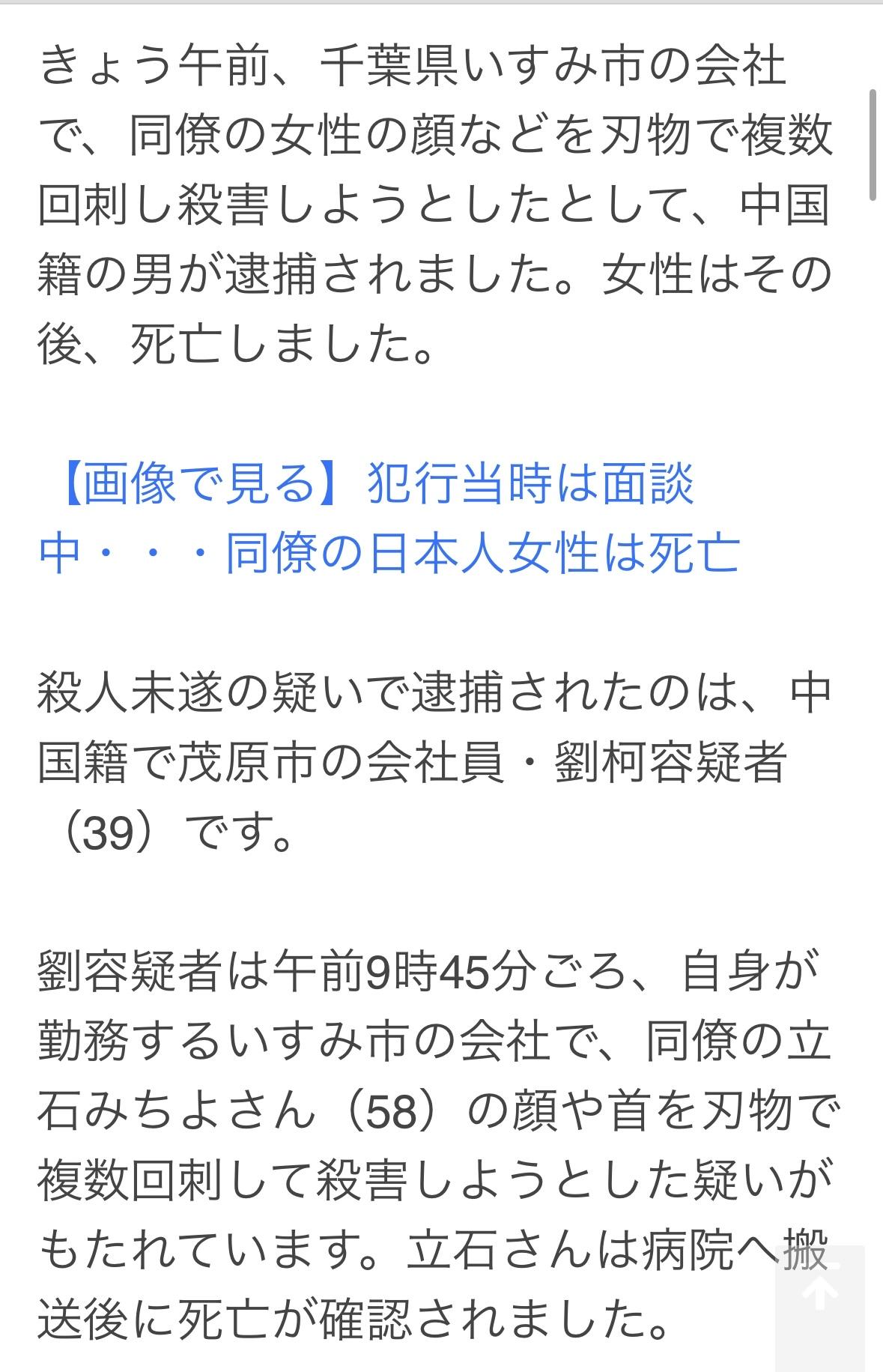 昨天,千葉茂原市在住39岁中国人刘某,在夷隅市的工作单位和同事交谈中持刀将对方杀死,死者是58岁日本女性。