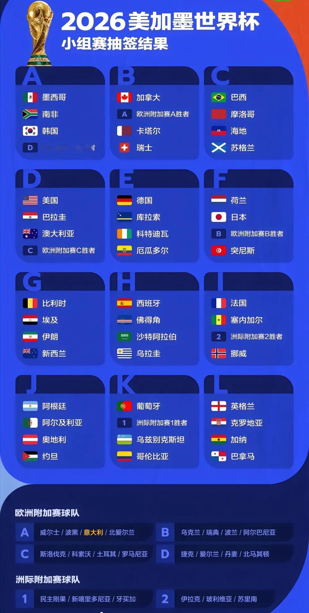 2026年美加墨世界杯抽签分组结束!超级死亡之组并未出现,但法国和挪威被抽到了同一小组,姆巴佩与哈兰德将在小组赛直接对决,巴西与摩洛哥同组,巴西主帅安切洛蒂表情耐人寻味。 而葡萄牙与阿根廷均是上上签,小组出线应该均不成问题。最新世界杯夺冠赔率也来了:第三名是法国,第二名为巴西,第一名是西班牙!