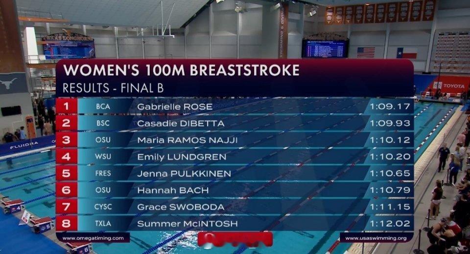 美国游泳公开赛 女100蛙B组决赛Summer 1:12.02 第八应该是为一伙儿100仰蓄力放了