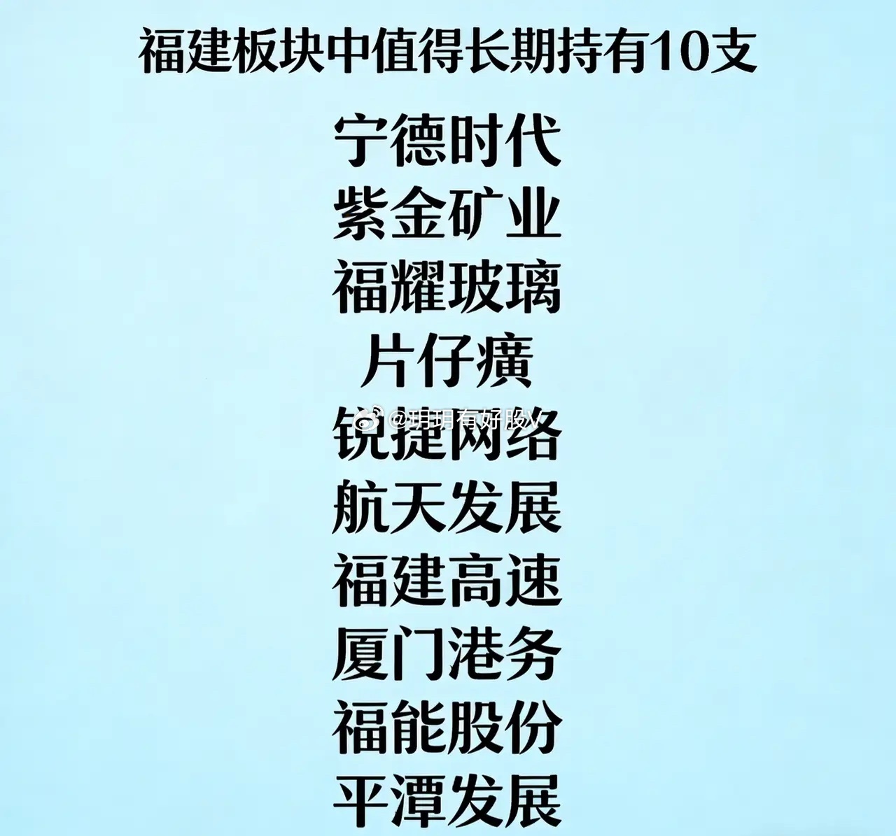 福建板块,持续走强,竟然20支股票涨停,值得长期关注的10支股票,具体信息分析如下:1. 宁德时代(300750):全球领先的动力电池系统提供商,2025年三季报显示每股收益11.02元,净资产收益率15.60%,销售净利率18.47%,业绩优异,在新能源汽车行业快速发展的背景下,具有广阔的发展空间。2. 紫金矿业(601899):全球重要的矿产资源企业,2025年三季报每股收益1.425元,净资产收益率22.36%,销售净利率17.98%,资源储备丰富,盈利能力强,随着全球经济的发展,对矿产资源的需求持续增长,公司有望受益。3. 福耀玻璃(600660):汽车玻璃行业的龙头企业,在全球市场具有较高的占有率,产品质量和品牌知名度高,随着汽车行业的稳定发展以及新能源汽车对玻璃需求的增加,公司业绩有望持续增长。4. 片仔癀(600436):国家绝密级中药品种,具有独特的品牌优势和产品竞争力,2025年三季报显示每股收益2.66元,净资产收益率15.72%,销售净利率29.07%,业绩稳定增长,在中药行业中具有较高的投资价值。5. 锐捷网络(301165):国内少数掌握SDN核心技术企业,数据中心交换机市占率提升,2025年Q1净利润同比增4543%,受益“东数西算”扩容,是福建算力基建核心受益者,长期成长确定性高。6. 航天发展(000547):军工+商业航天双主业,已发射22颗“天目一号”卫星,获8.5亿电磁防护大单,福建规划千亿级商业航天产业集群,公司有望充分受益。7. 福建高速(600033):区域交通基建龙头,PE仅10倍,股息率超5%,日均车流量增长15%+,受益于两岸融合带来的物流增长以及交通互联互通红利,适合稳健型投资者长期持有。8. 厦门港务(000905):拟收购集装箱码头集团70%股权,能力将增67%,若厦金航线恢复,客运量将大增,直航红利可期,是闽台海上物流主枢纽,具有较高的投资价值。9. 福能股份(600483):福建风电资产优质,推进114MW海上风电,集团承诺注入约1.2GW海风与抽蓄指标,PE仅9.3倍,高成长低估值,未来发展潜力较大。10. 平潭发展(000592):平潭唯一上市平台,拥有128平方公里土地储备,距台湾最近“桥头堡”,直接受益两岸融合政策,与中免合作离岛免税项目,封关运作后将成最大赢家。以上内容均基于公开信息整理,不构成投资建议。