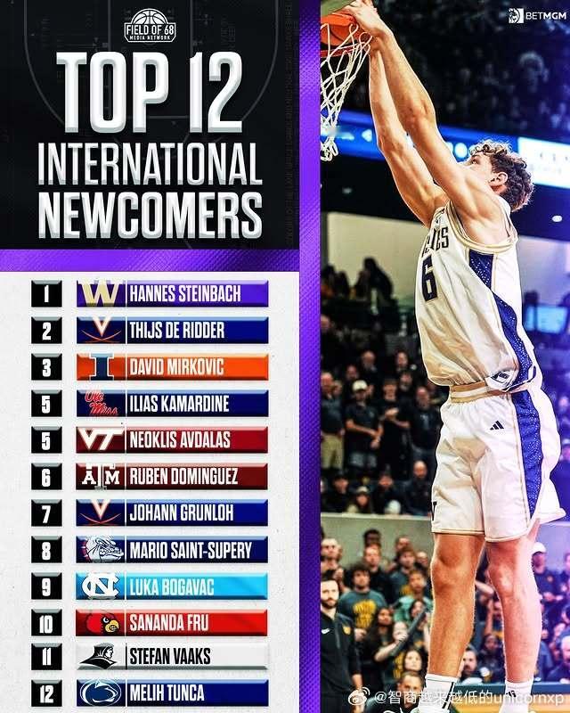 NIL政策让越来越多拥有职业履历的国际球员选择来NCAA发展,The Field of 68评选的本赛季Top12NCAA国际菜鸟新人NCAANBA