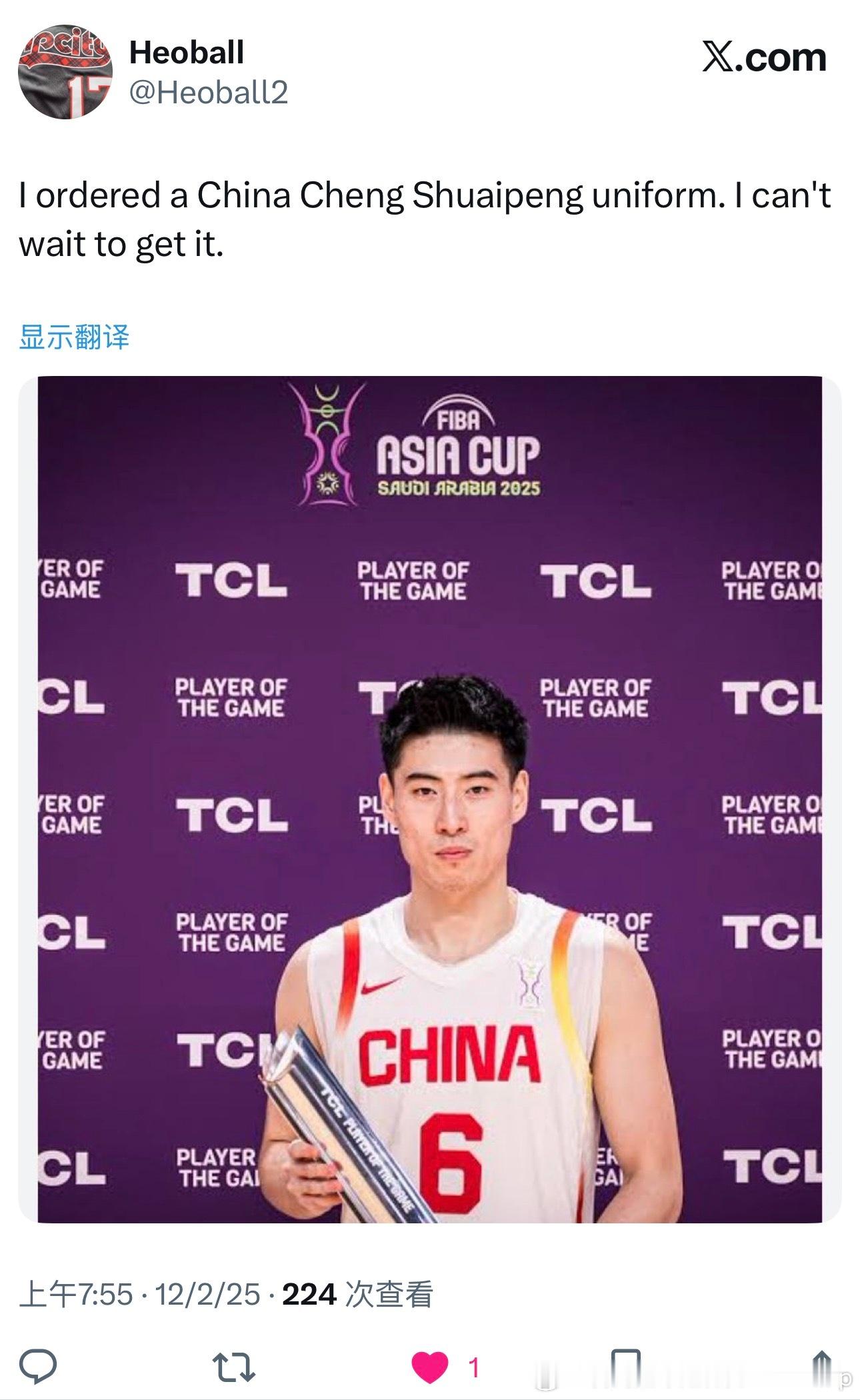 男篮世预赛第二场客场输给韩国队后,我的一位认识多年的韩国资深篮球爱好者喜欢上了程帅澎,并且还专门去订购了他的国家队球衣中国男篮