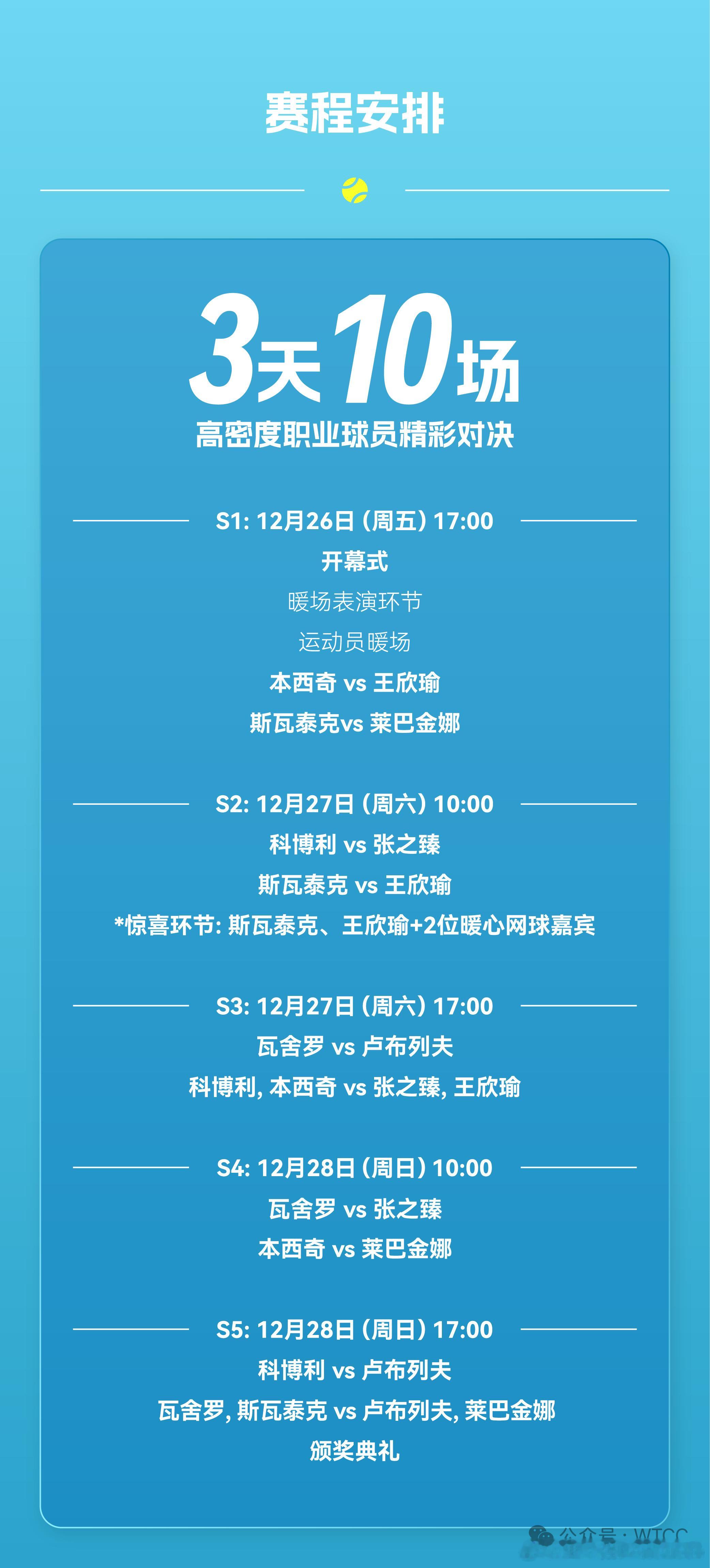 【送球票🎟️2.0】赛事倒计时20天之际!再送一点点福利!12月底深圳🇨🇳现场看Iga斯瓦泰克、Elena莱巴金娜、王欣瑜、本西奇、张之臻、卢布列夫、科波利、瓦舍罗!这波会抽出2位互动球迷,分别赠送表演赛比赛日的门票1张(有机会选择日期)比赛日期:12.26-12.28比赛地点:深圳大运中心参与方式:【转发】+【评论】这条博文,可以写一下想看哪个日子+想看球员(赛程表在图5)参与时间:即刻起至12.12日中午,会通过系统来抽出!!!感谢提供的机会!wta