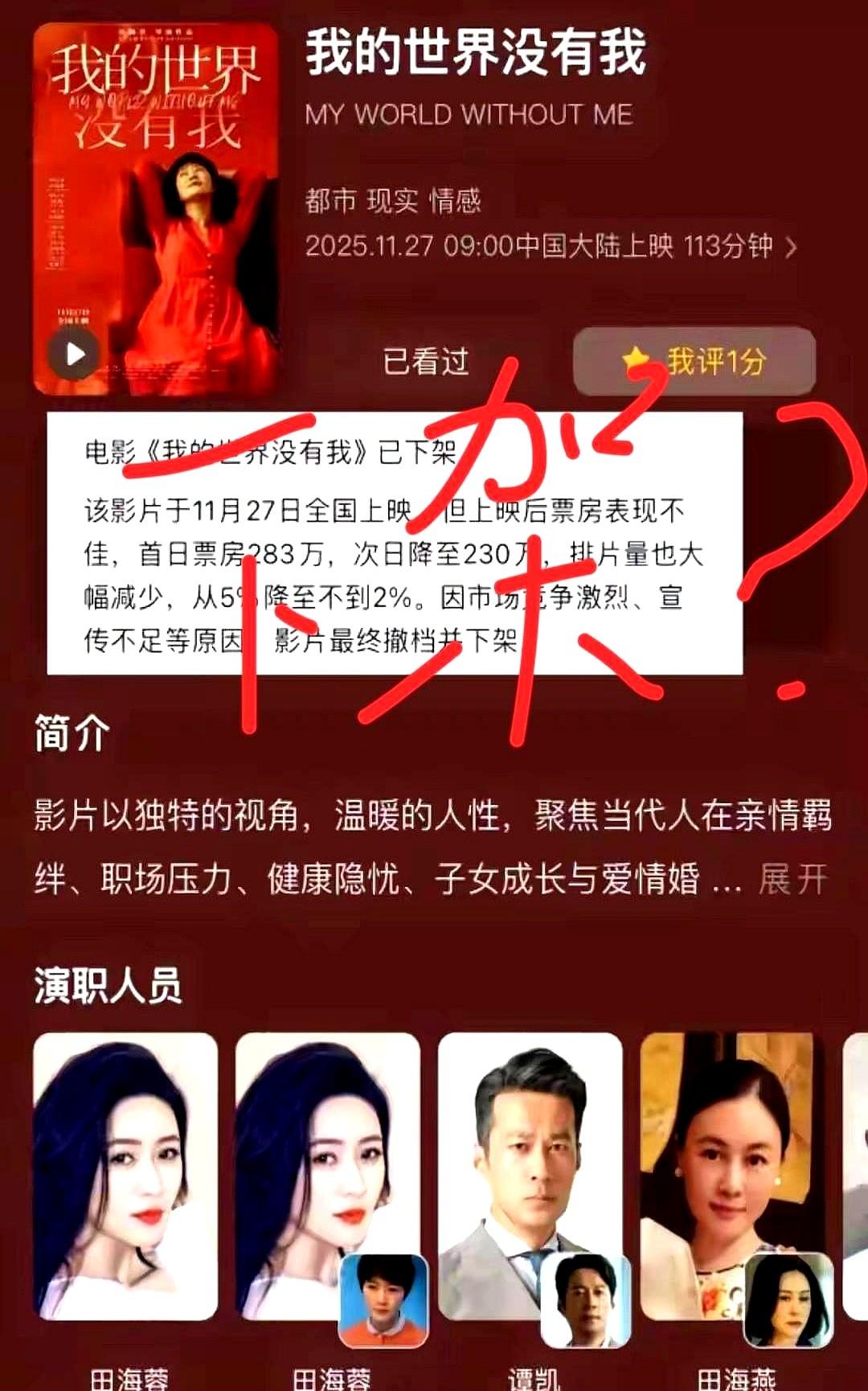 太扎心了! 现在网上都炸了,有人说《我的世界没有我》这操作比直接删了还膈应——售票APP里海报亮着、名字挂着,点进去却连个场次毛都没有,跟微信说“保持联系”却再也不回消息的人一样让人窝火;也有人骂这名字是乌鸦嘴,“我的世界没有我”直接咒了自己;还有人叹“影视寒冬真的来了”,观众连进影院共情的劲儿都没了,电影院的椅子比人还想念热闹。 你们忘了? 这片子本来是今年小成本里的“潜力股”! 导演之前拍《小欢喜》番外时,就靠“妈妈藏癌症报告时手抖”的细节戳哭一堆人,这次本来想接着用“北漂女孩偷偷给家里打钱”的真实感打动人,结果倒好,直接被“隐形雪藏”——不是没人想看,是连“看”的机会都不给! 我真是笑了,什么“观众累了”? 明明是有人先凉了心! 观众不是不愿进影院,是被烂片骗怕了! 你要是有《药神》那种往人心里扎的东西,谁会舍不得那俩小时? 现在倒好,好好的片子被“蒸发”成空气,到底是市场凉了,还是搞影视的先丢了“让人想看”的诚意? 这事儿你们咋看?是片子真不行,还是咱们观众“累”得太冤?