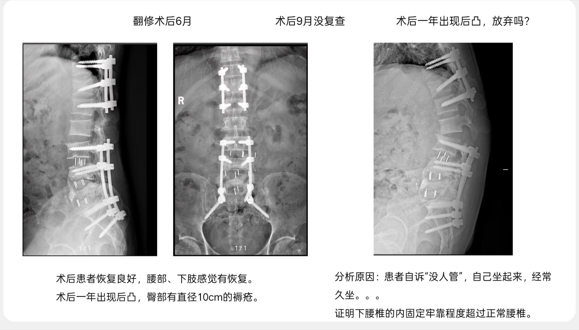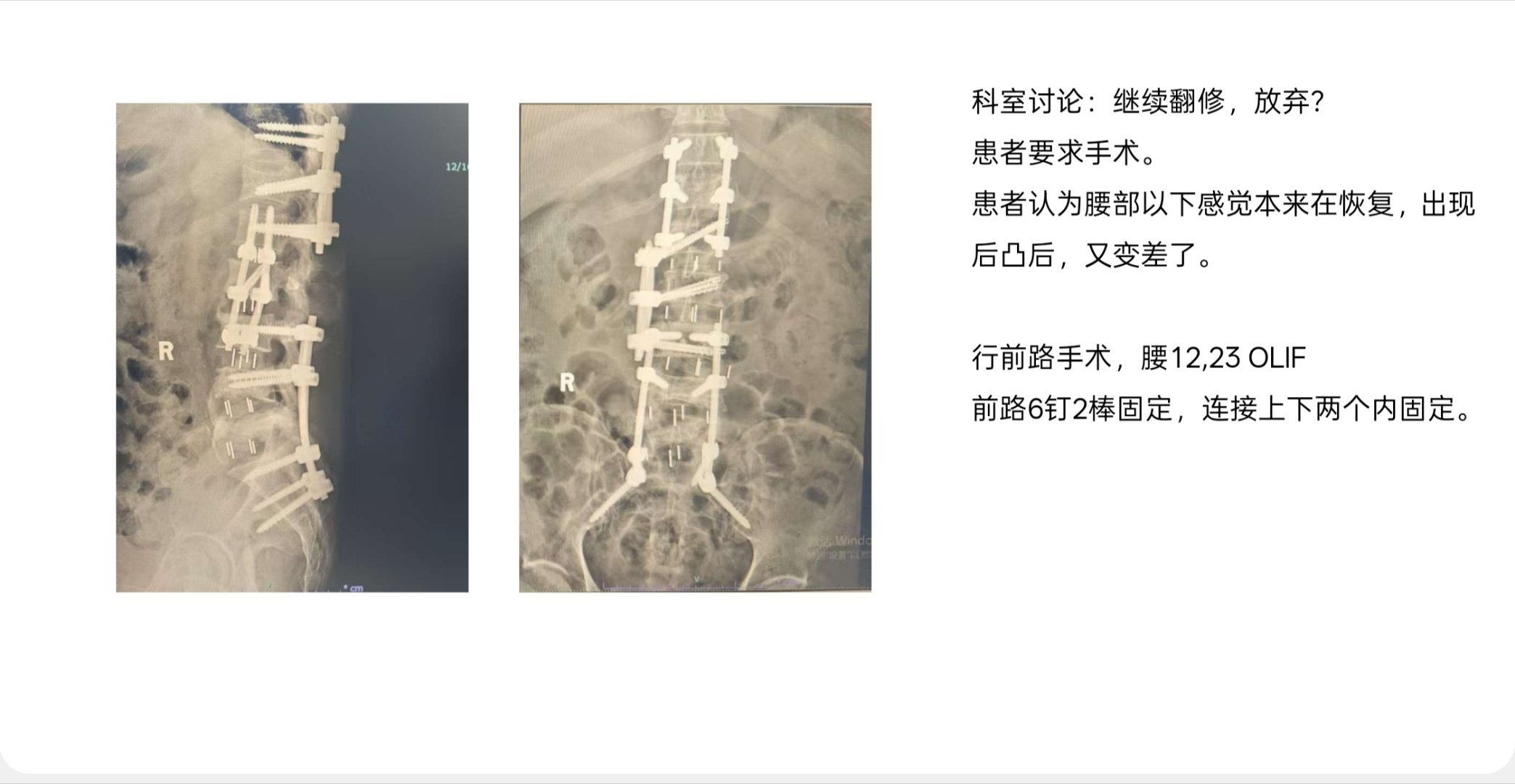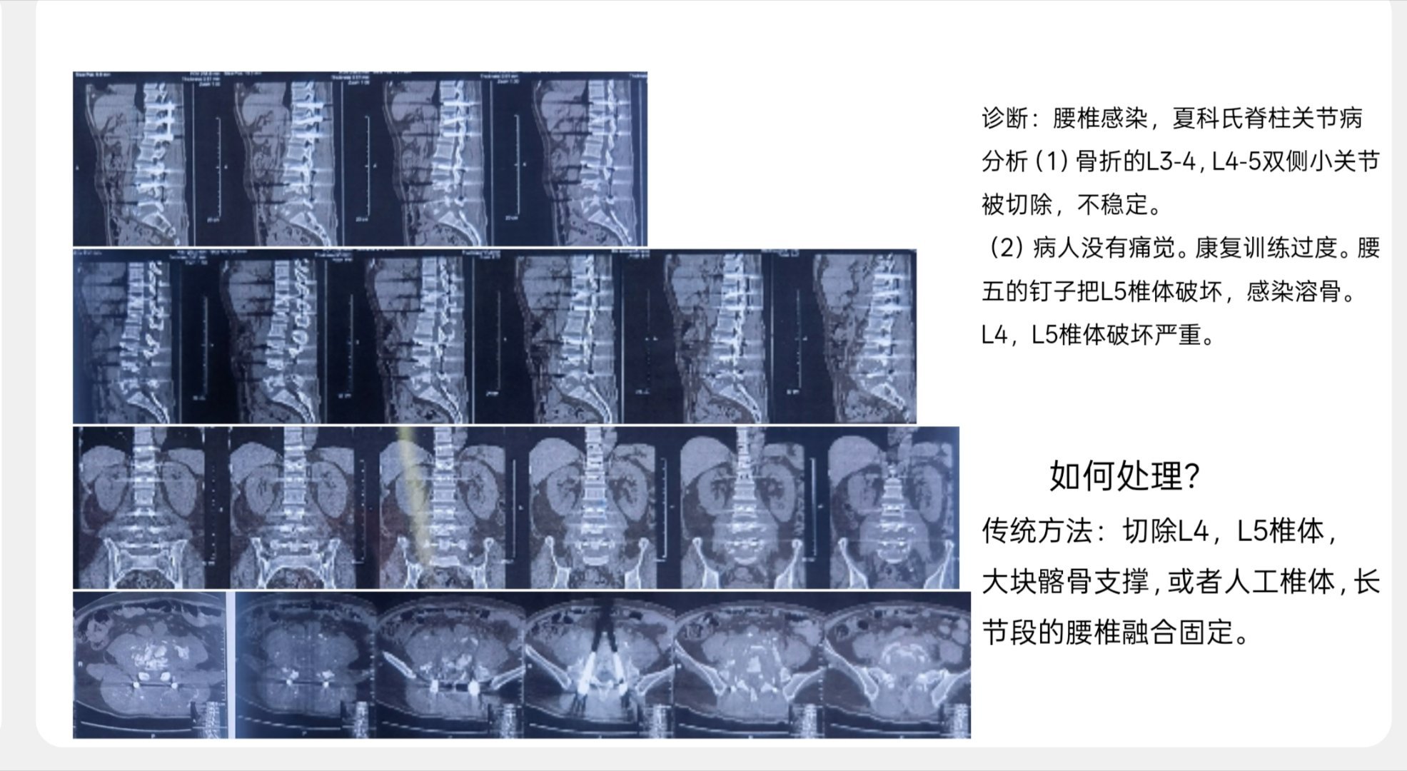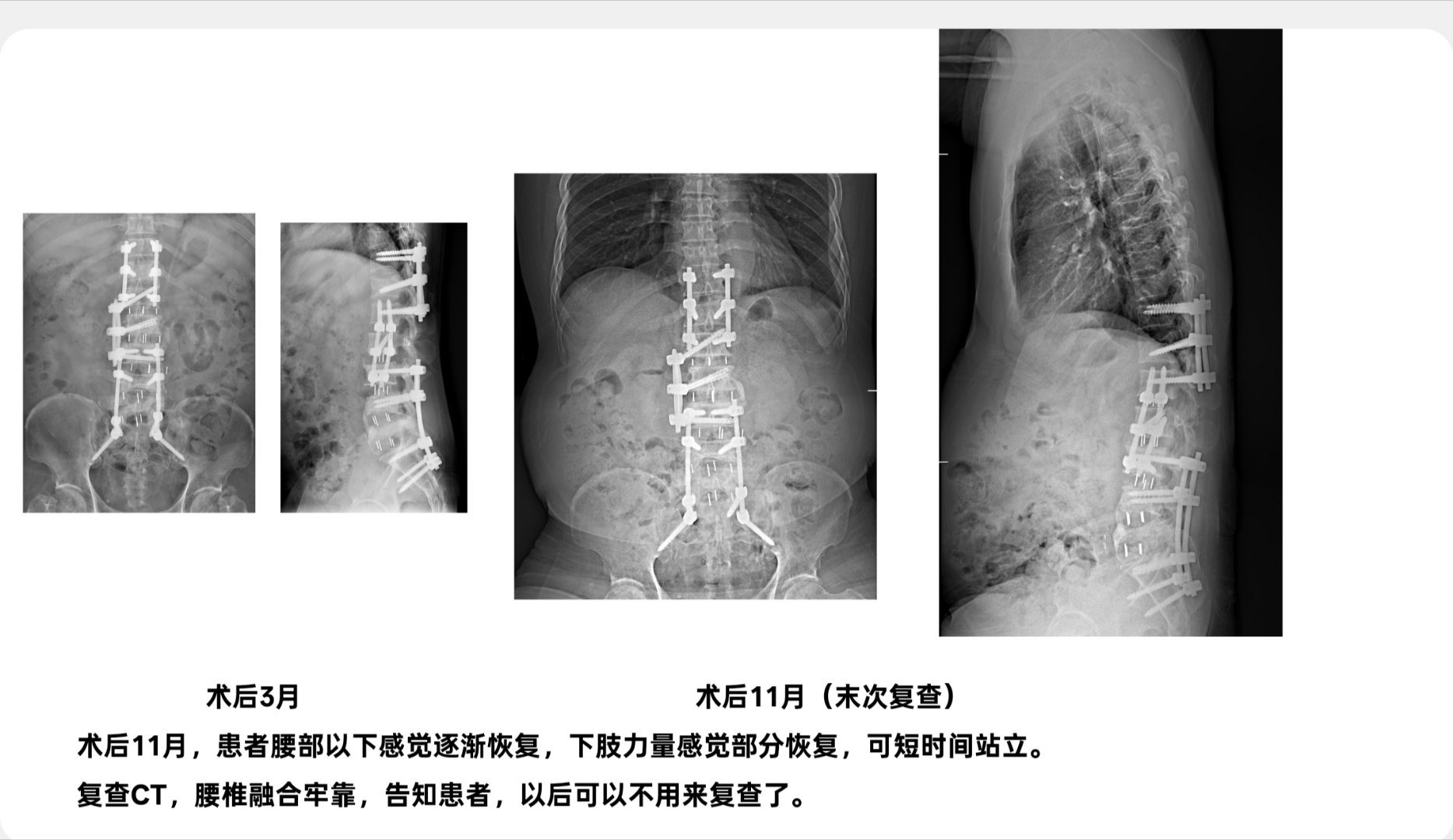 伤后两年半,历经三次手术,全瘫、内固定失败、巨大骨缺损、感染、巨大褥疮的病人站起来了。困难的翻修手术,辗转十几家大医院,无人接收。现在腰部和双腿的感觉部分恢复了,意味着夏科氏脊柱关节病不治而愈。所以,患者腰痛,反而是好事。腰痛