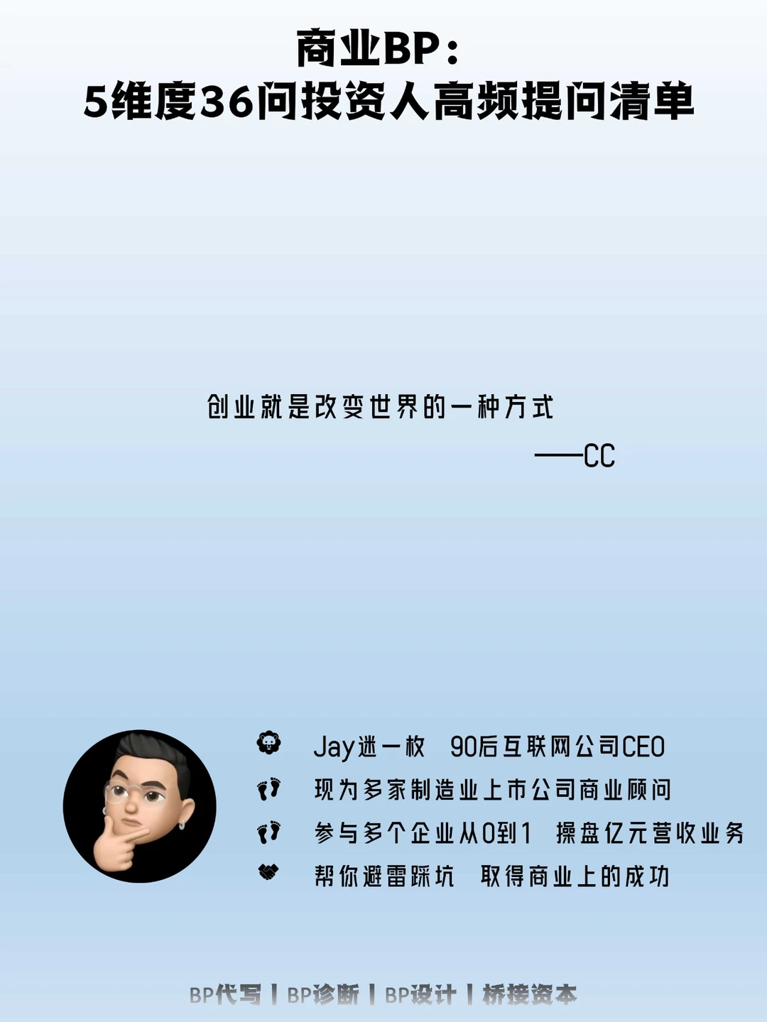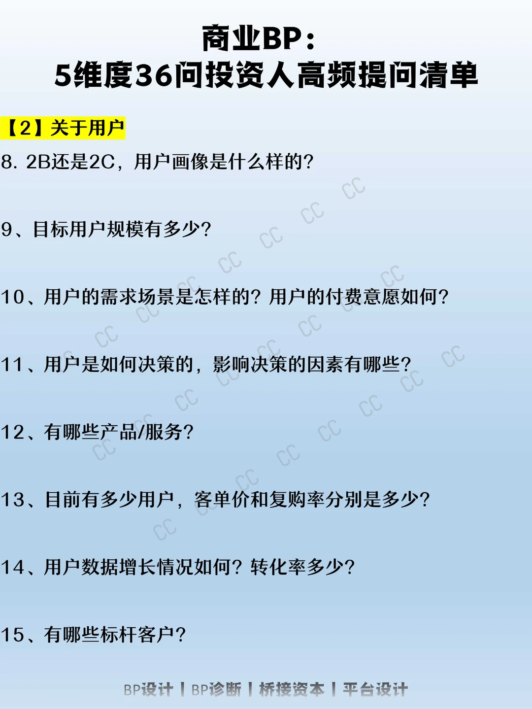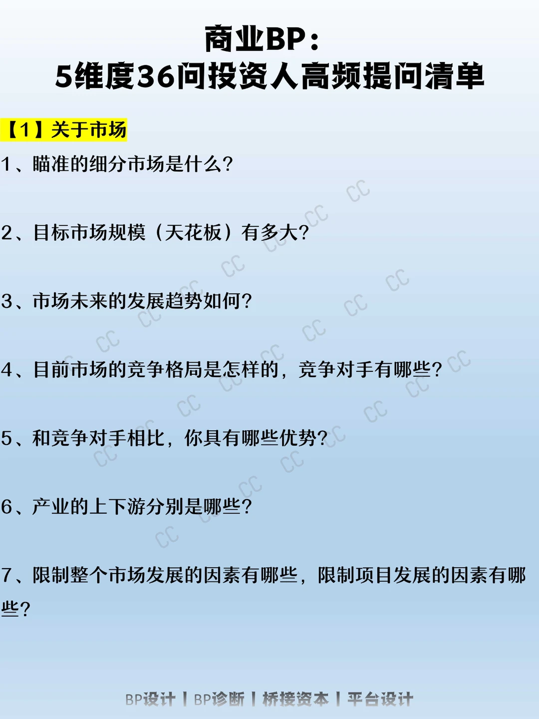 【1】关于市场 【2】关于用户 【3】关于商业模式 【4】关于团队 【5】关于融资