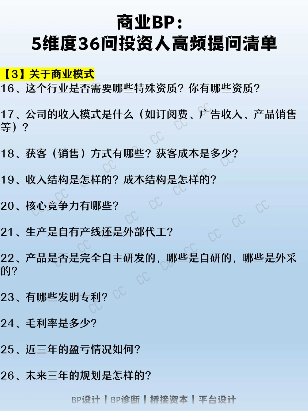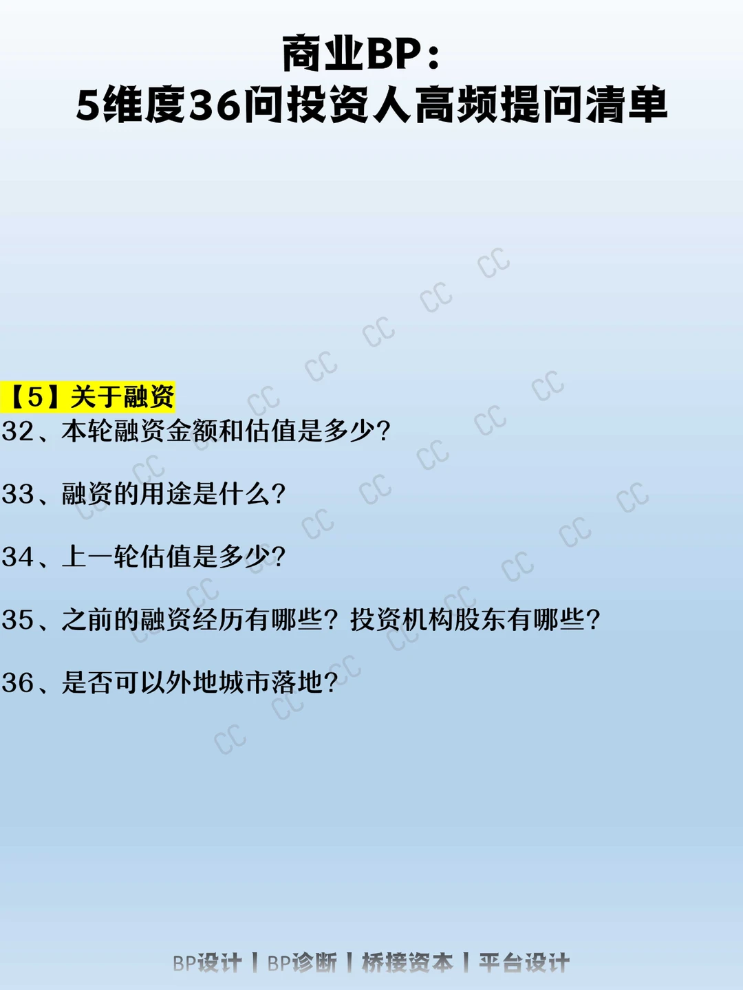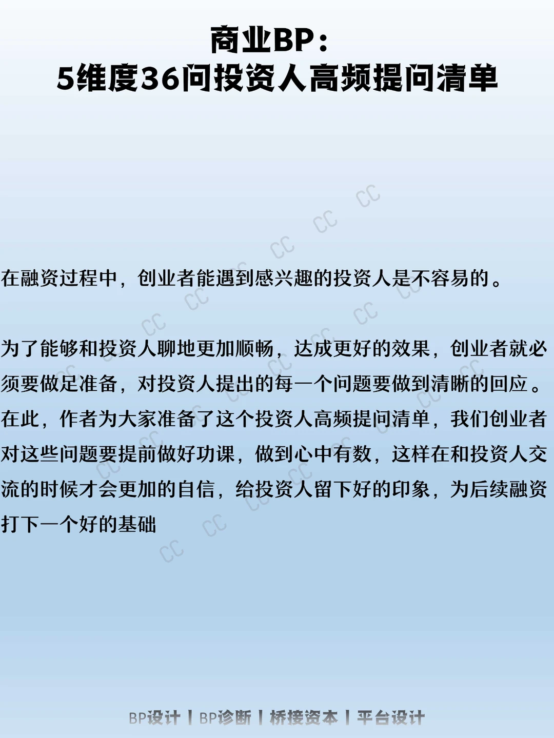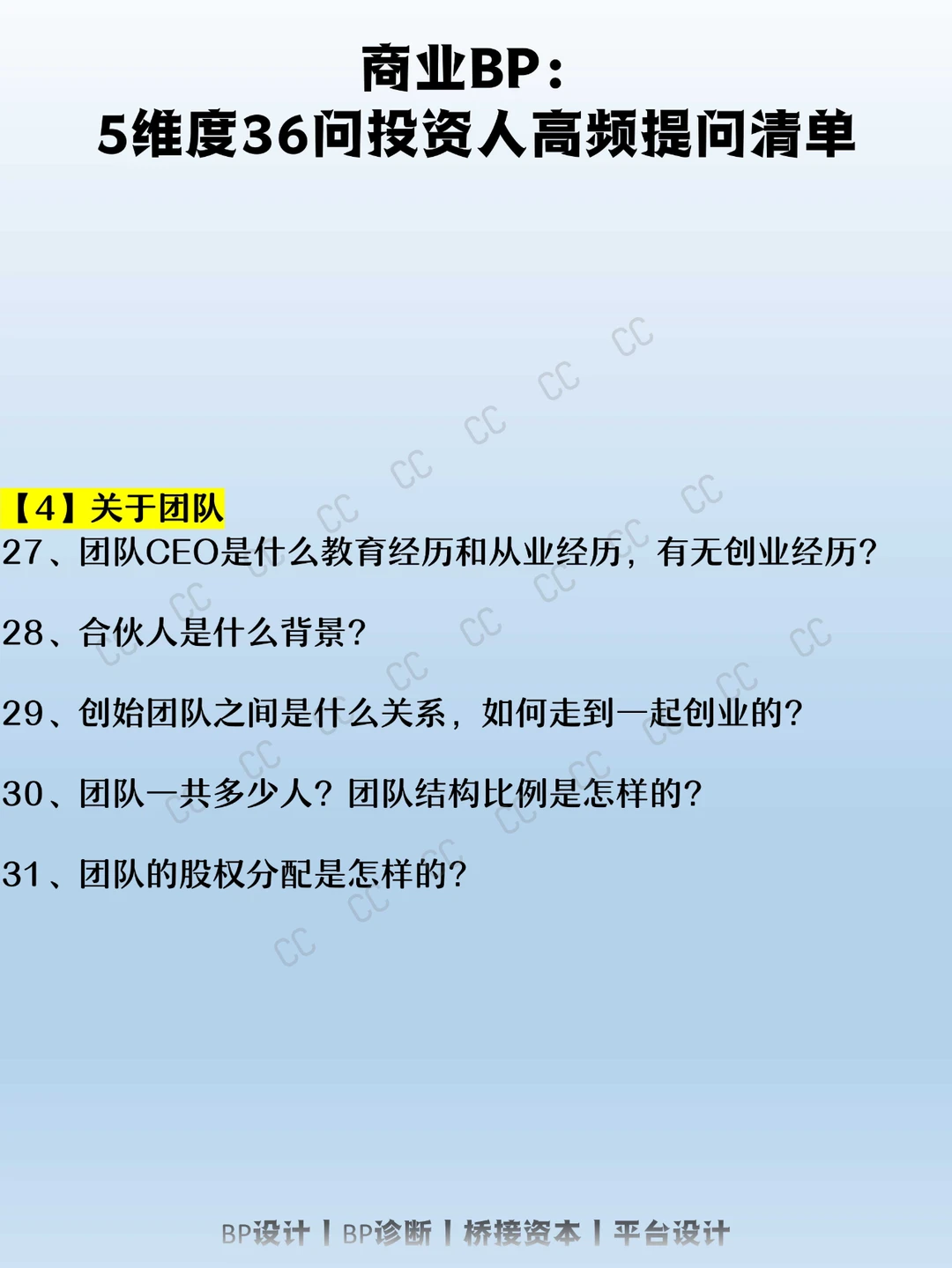 【1】关于市场 【2】关于用户 【3】关于商业模式 【4】关于团队 【5】关于融资