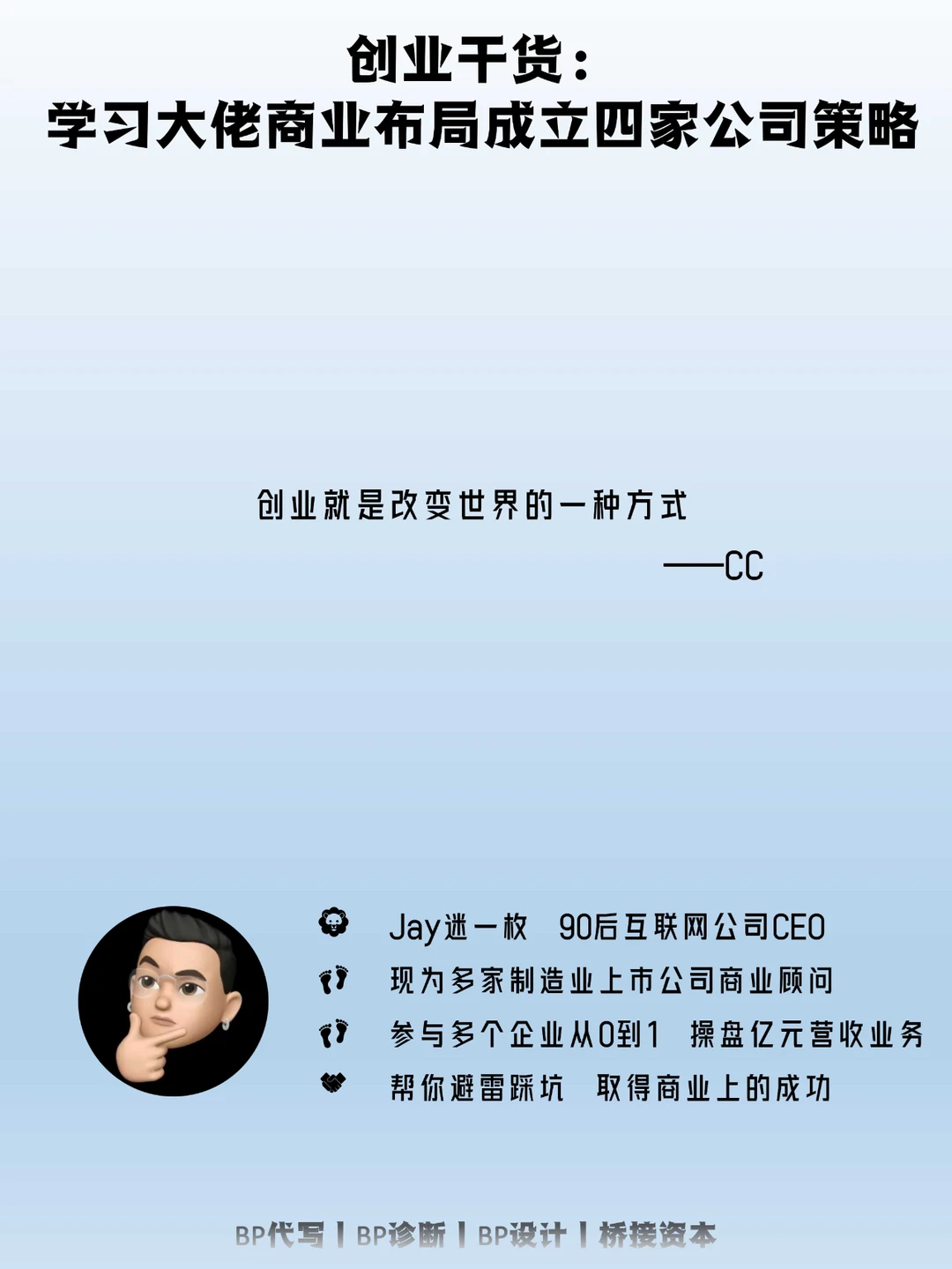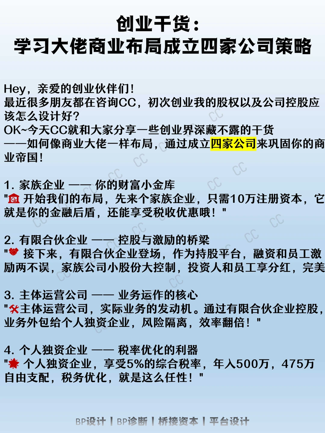 Hey,亲爱的创业伙伴们! 最近很多朋友都在咨询CC,初次创业我的股权以及公司控股应该怎么设计好? OK~今天CC就和大家分享一些创业界深藏不露的干货 ——如何像商业大佬一样布局,通过成立四家公司来巩固你的商业帝国!