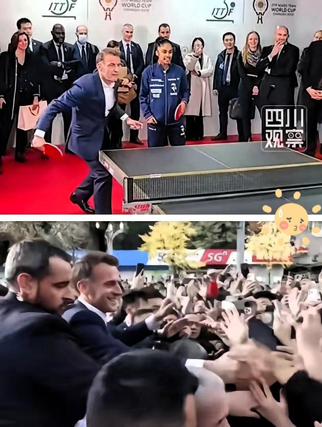 全世界都知道了! 法国总统马克龙访华,居然连夜来到了成都,去了四川大学,还和王楚钦孙颖莎打球。 在川大体育馆,他没打领带,先抛一句今天很轻松,跟学生说别怕把时间用在看世界上,多去碰不同文化,问答一直续着,讲台前有人举手,他把时间往后挪,多留两个问题,眼神扫过一圈,笔记本翻到空白页,他站着不急,学生坐着不散。 行程拧得紧,早上看都江堰的工程,水路怎么分,石头怎么摆,他走到边上听解说,中午车子回城,下午在学校里聊成长和交换,书包靠在椅子腿,校徽别在衣领,转身又去了省体育馆,球拍拿起来,他用中文喊莎莎,点名和孙颖莎打个混双,球一落台边脚步跟着挪,裁判桌有人按表,边上掌心碰拍,镜头跟着球走。 他说这次的遗憾是时间短,抬手看表,四次来中国,每次换地方,这趟带了约三十所法国高校的代表,名单厚厚一叠,会议室一张长桌,川大这边老师把合作方向摆出来,专业对专业,项目对项目,行程卡片一列列贴在墙上。 夫人去了看圆梦,这只在法国出生的大熊猫,回到四川后住在这边基地,饲养员讲了作息,竹子怎么分配,随行的部长们把文化和环保拿出来谈,方案一页一页翻,前十一个月法国人来四川的人次涨了五成多,数字写在通报上,背后是航线在加密,学校在互访,企业在对接。 从都江堰的老办法看水到位,走到乒乓球桌旁边看年轻人出手,再到教室里把问题摆开,成都这二十四小时,像剪了一段短片放出来,人和人面对面,话题从工程到运动再到课堂,把交流这两个字,落在具体的场景里。