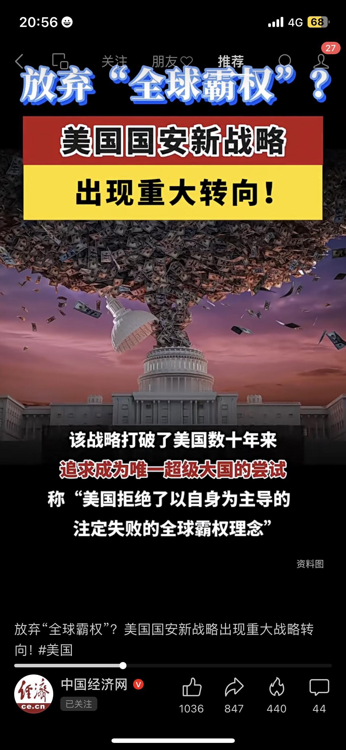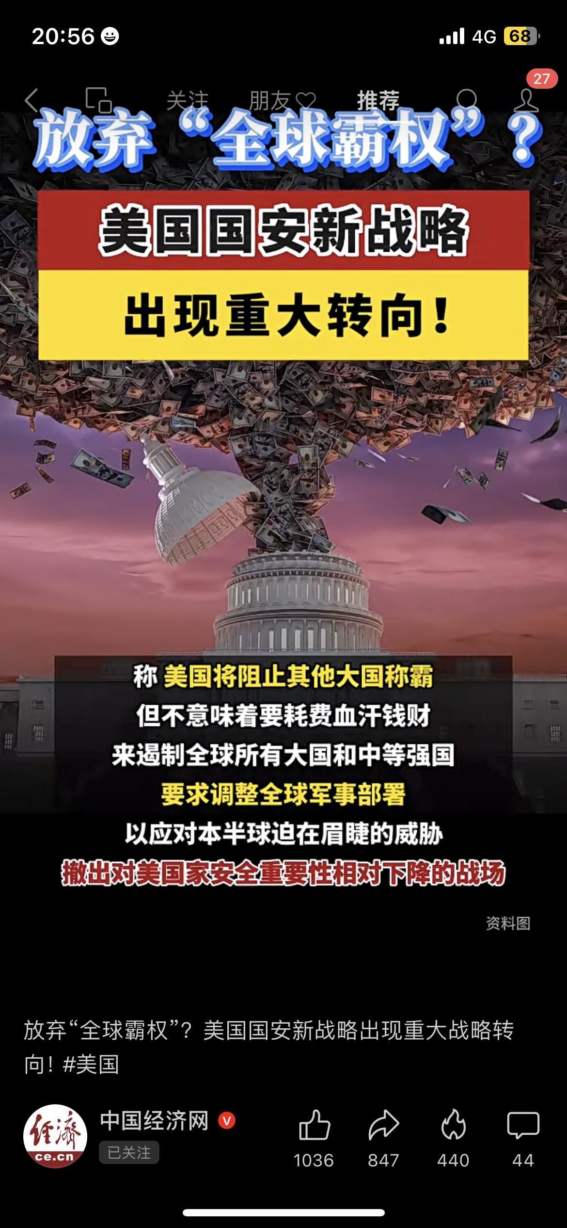 美国新版国安战略:调整对华经济关系,重心转向拉美 白宫刚发布的新版《国家安全战略》有两个核心变化,值得留意。一是称将以“互惠平等”为原则调整与中国的经济关系,同时强调重振美国经济自主地位;二是战略重心从长期关注的亚洲转向拉美,计划扩大西半球军事存在应对移民、毒品问题。 小众角度看,这一转向其实是美国对自身资源的重新分配,拉美作为“后院”的优先级被提升。实用增量一是可关注中美经济互动的新动态,比如贸易规则的微调;二是拉美相关领域的合作可能会增加,可留意该区域的产业机会。个人觉得战略调整是基于自身需求的选择,后续实际落地效果还得看具体动作。 你怎么看这次美国战略的重心变化?①以上内容核心事实均来自公开权威信息,仅供参考,具体可以官方最新通报为准;②个人解读仅代表客观分析,不构成任何引导,理性看待热点更重要。