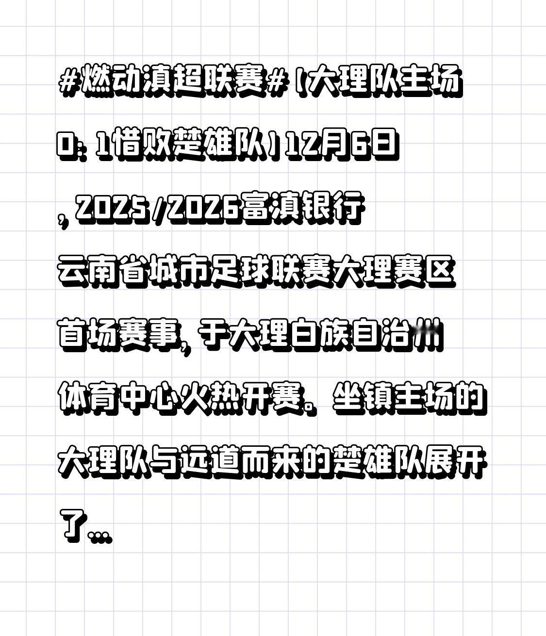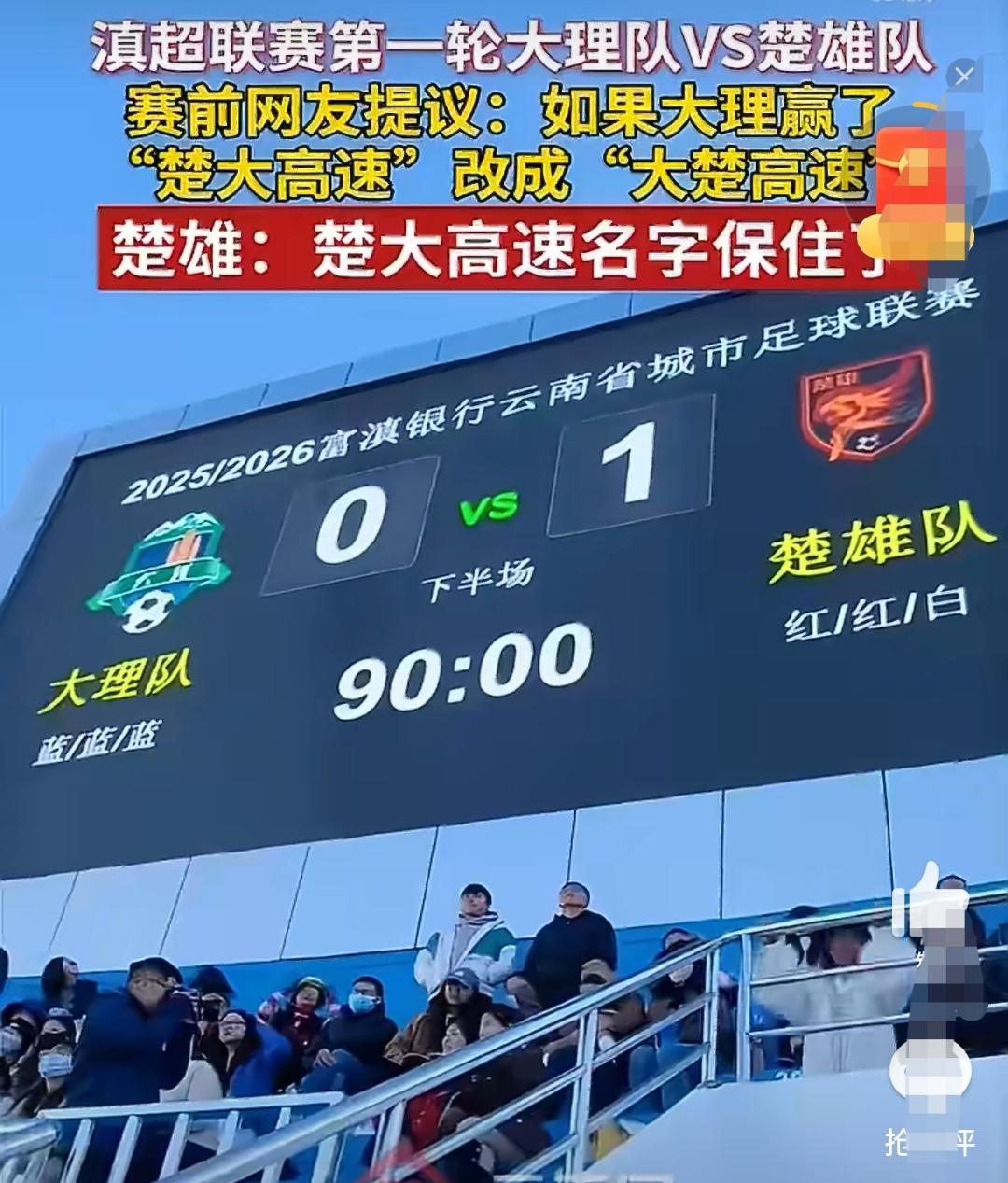 【大理队主场0:1惜败楚雄队】12月6日,2025/2026富滇银行云南省城市足球联赛大理赛区首场赛事,于大理白族自治州体育中心火热开赛。坐镇主场的大理队与远道而来的楚雄队展开了一场激烈对决,历经90分钟的鏖战,大理队最终以0:1遗憾落败。 云南足球联赛 【滇超联赛第一轮大理队VS楚雄队:楚大高速名字保住了】滇超联赛第一轮,大理队对阵楚雄队。赛前有网友提议,若大理队获胜,就把“楚大高速”改为“大楚高速”,如今看来,楚雄队此番取胜,“楚大高速”的名字算是保住了。 云南🥁队 这就是云南足球 滇超联赛 滇超球队
