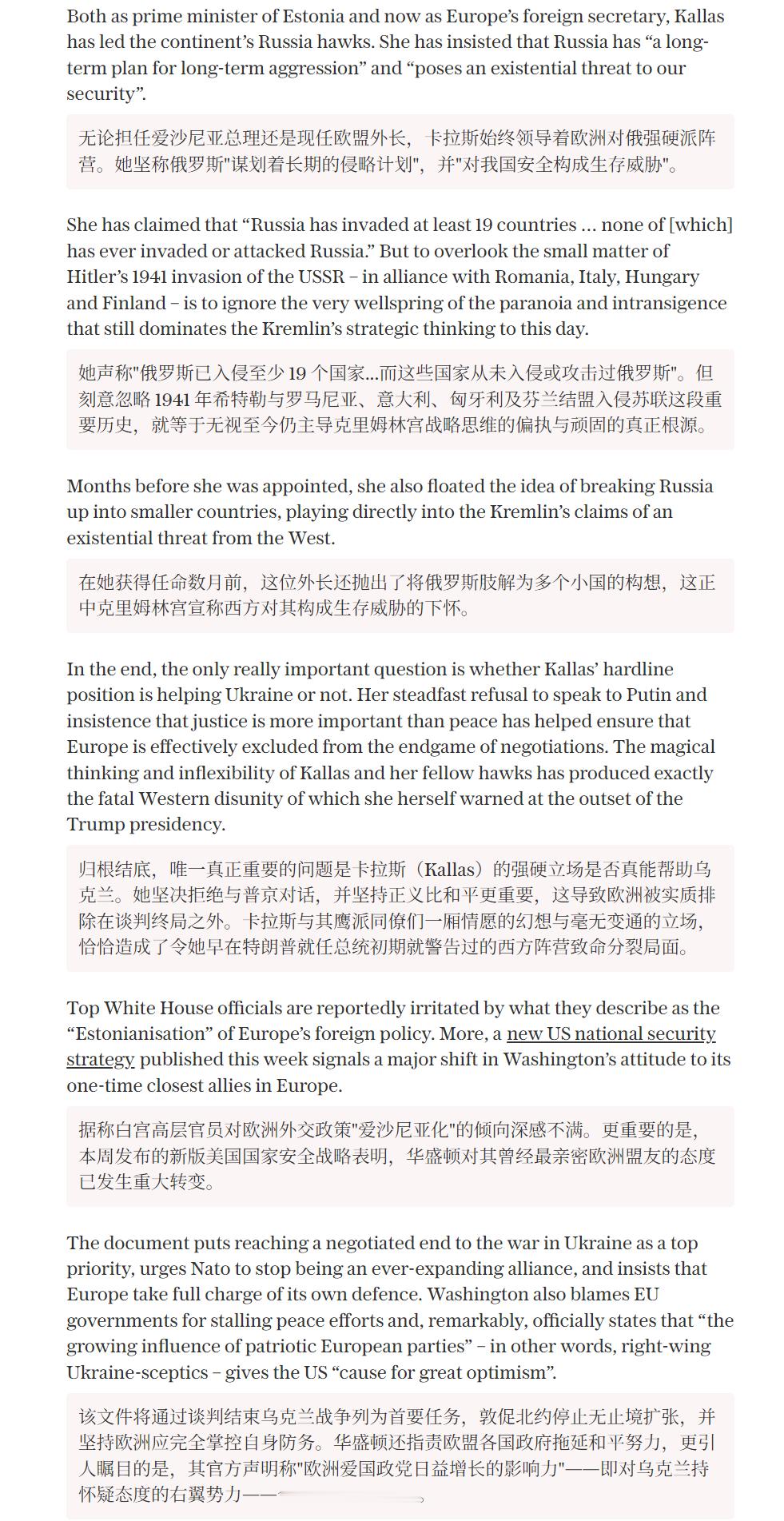 🔻英国电讯报称:卡娅卡拉斯是送给克里姆林宫的最好礼物,由于卡娅卡拉斯风骚的反俄低级操作,欧洲正在被排除在决定欧洲大陆未来安全架构的关键谈判桌之外。🔻就差喊“她是俄国特务”了。热点现场海外新鲜事