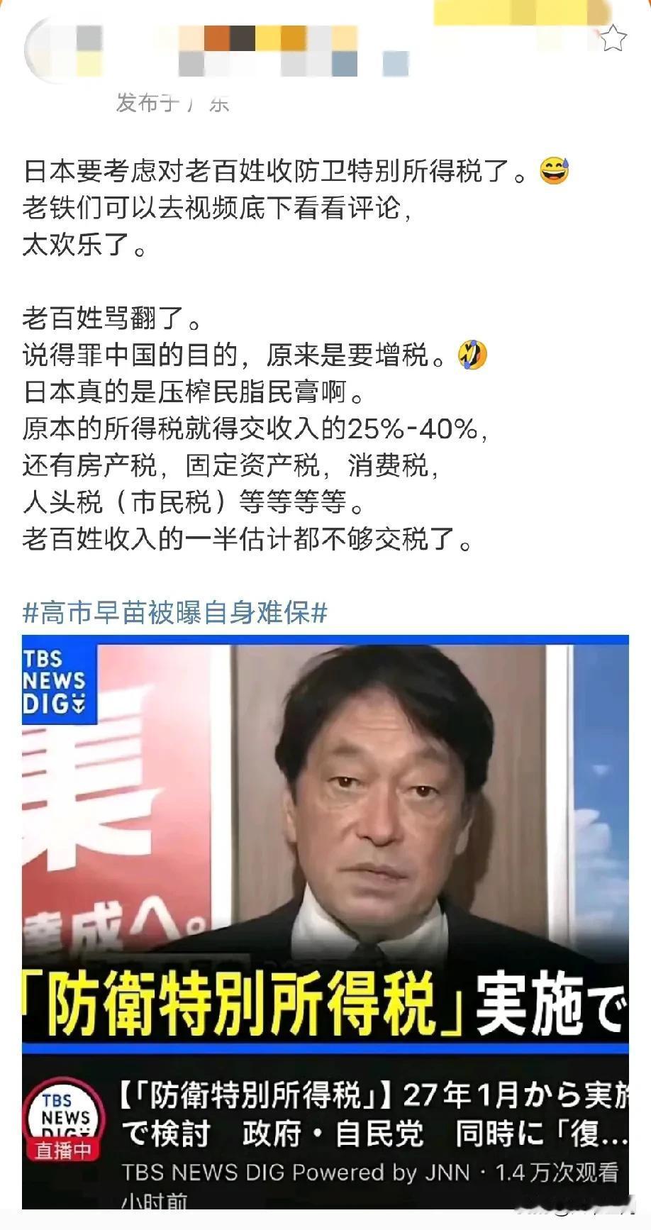 日本考虑征收国防税,结果老日本网民骂街了,说原因搞这么大一圈,是为了征税,本来日本人的税负很重,收入一半都交税了,现在又准备要征国防税!事实证明网上大多都是嘴炮,只会口嗨,虽然高市早苗民调高达80%,但是真让它们多交点,它们就骂街了,如果让它们上战场呢?估计更少人要去了,小编觉得日本的精英,特别是这些右翼政客是真的要搞重新武装的,而且不会停下来的,就算高市早苗下台,也不会撤回言论,这个征国防税,不管日本人愿不愿意,这些右翼政客一定会推行的!