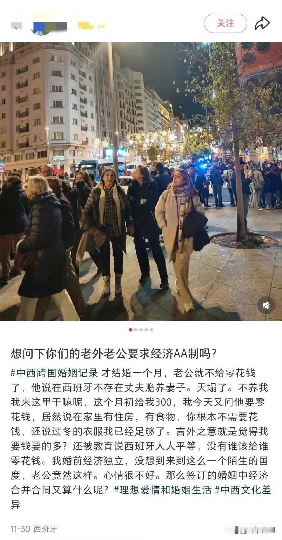 刷到公知称40+的中国女性在欧美非常吃香,所以别妄自菲薄,要自信!然后又刷到了36岁的中国女博主二婚嫁西班牙,刚开始还在晒和西班牙的幸福生活,结果不到一个月,西班牙老公提出AA制,把给她的零花钱给停了,西班牙老公说在西班牙不存在丈夫赡养妻子的,因为西班牙人人平等,不存在谁赡养谁,每个月300欧的零花钱都停掉了,连过冬买衣服的钱都不给了,这个女博主称自己婚前经济独立,但是现在来到一个陌生的国度,老公竟然这样做,搞得自己心情很不好,它觉得签订的那些婚姻中经济合同又算什么呢? 这两个消息,我到底该相信哪个呢?我只能说有些人就是身在福中不知福,非要出去被现实打脸,国外可是真的会跟你AA制的,这才是平等!