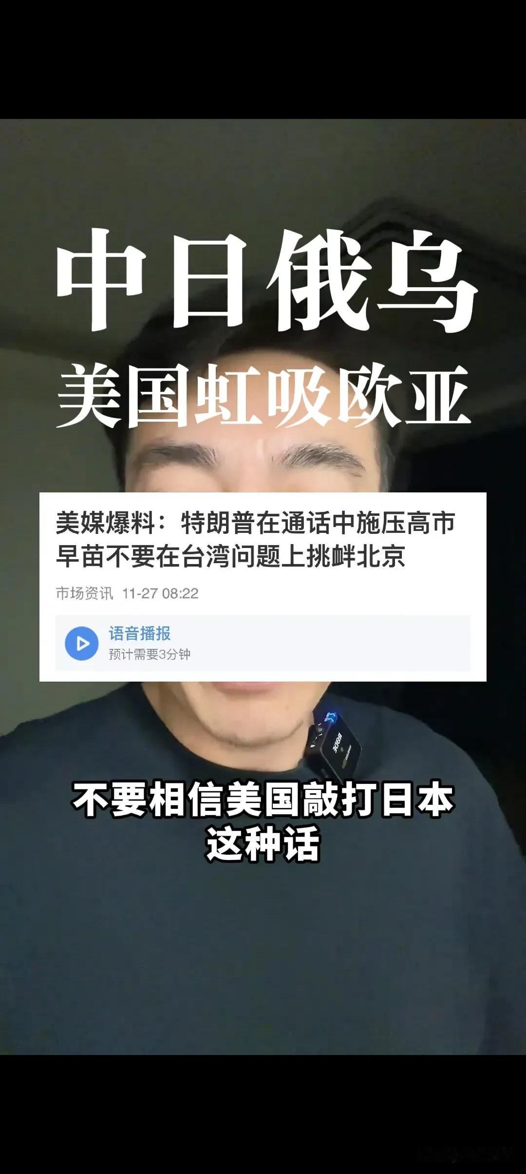 从纯金融资本逻辑来看,高市早苗就是川普在背后指使的,偶然看到有个金融博主分析,观点非常有趣,就是川普刚刚和我们休战一年,立马俄乌28点计划和高市早苗的言论就出来了,这是美国利用俄乌冲突和高市早苗在欧亚大陆的两边挤压,让全球的资本不会去欧洲,也不会来东亚这边,俄乌28点计划明显就是川普故意搞一个欧乌都不会同意的计划,一次次先给资本希望,然后谈判破了,一次次强化资本对俄乌停火的失望,那资本只有去美国或者东亚,这个时候川普刚和我们休战一年,资本最理想的去处就是东亚了,川普就让高市早苗跳出来,想来东亚的资本就会被吓到了,只能去美国了,但川普也怕我们真的打日本,所以就假装给高市早苗打电话,表面是敲打,实则是告诉高市早苗把握好尺度,不要彻底惹怒我们,所以高市早苗退了半步,就在退和不退之间徘徊,配合美国把想来东亚的资本赶到美国!