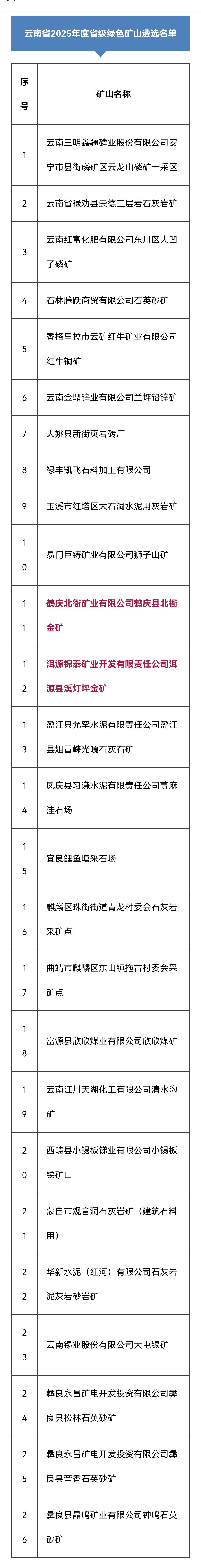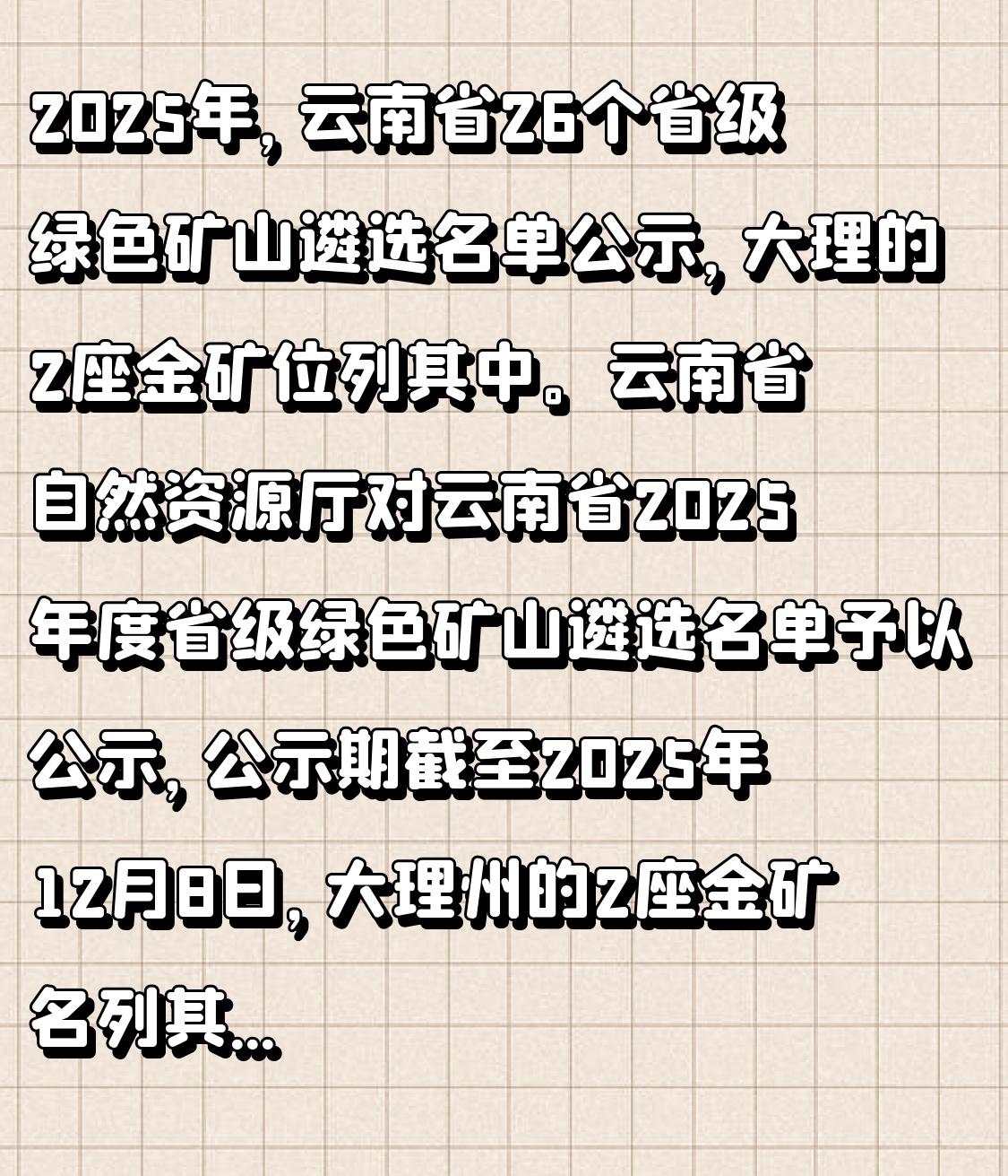 2025年,云南省26个省级绿色矿山遴选名单公示,大理的2座金矿位列其中。 云南省自然资源厅对云南省2025年度省级绿色矿山遴选名单予以公示,公示期截至2025年12月8日,大理州的2座金矿名列其中。 按照相关要求,经县级初审、州级复审、企业自评、第三方评估、省级复核,26个申报矿山满足省级绿色矿山遴选先决条件,符合遴选程序,达到省级绿色矿山评价指标各项要求,拟纳入省级绿色矿山名录。 绿色矿山政策 云南矿产业 现代化绿色矿山 云南矿山绿化 云南金属矿山