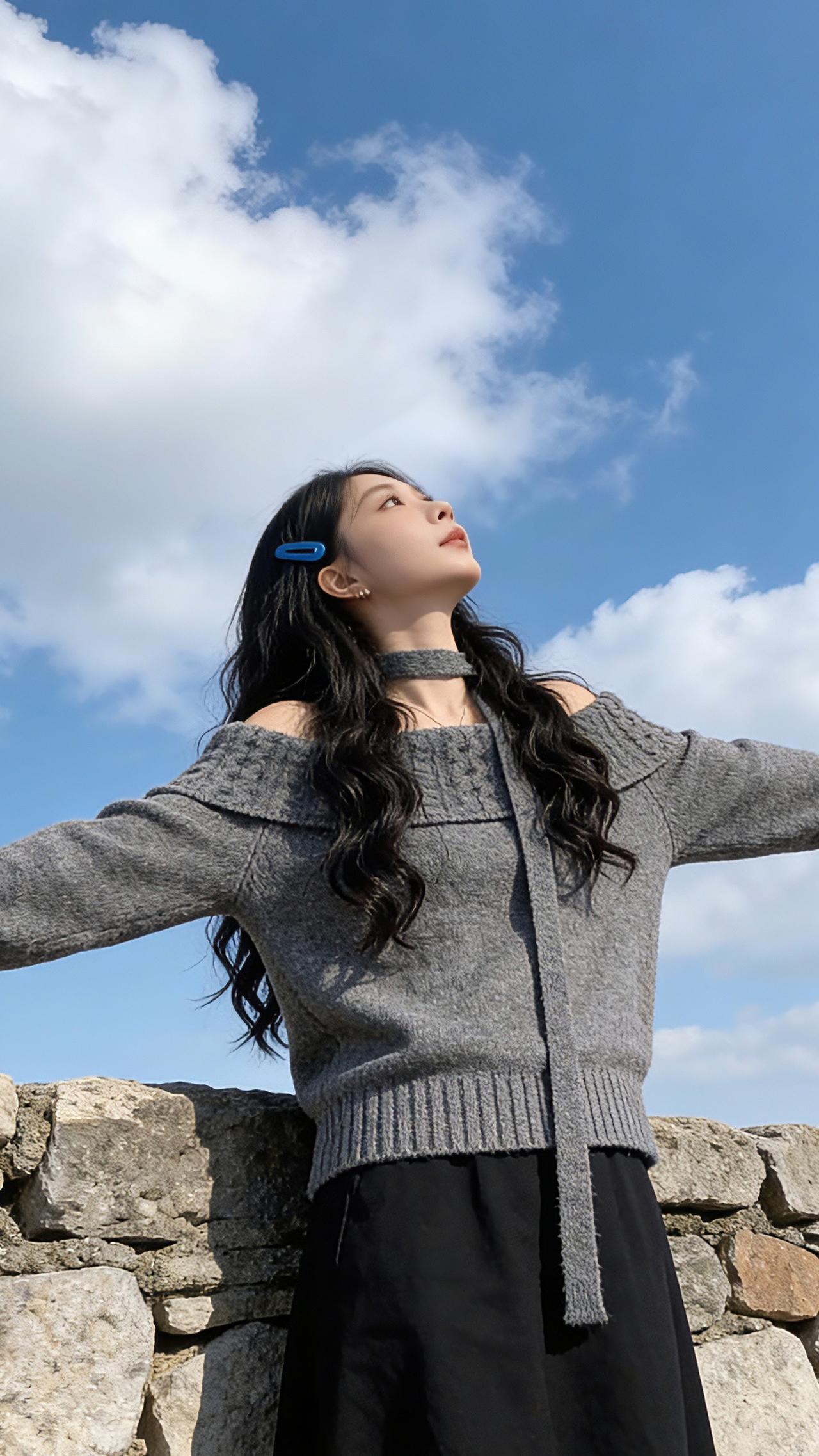 谁懂啊!灰调毛衣+露肩设计也太会拿捏松弛感了! 绞花纹理自带慵懒滤镜,挂脖系带是