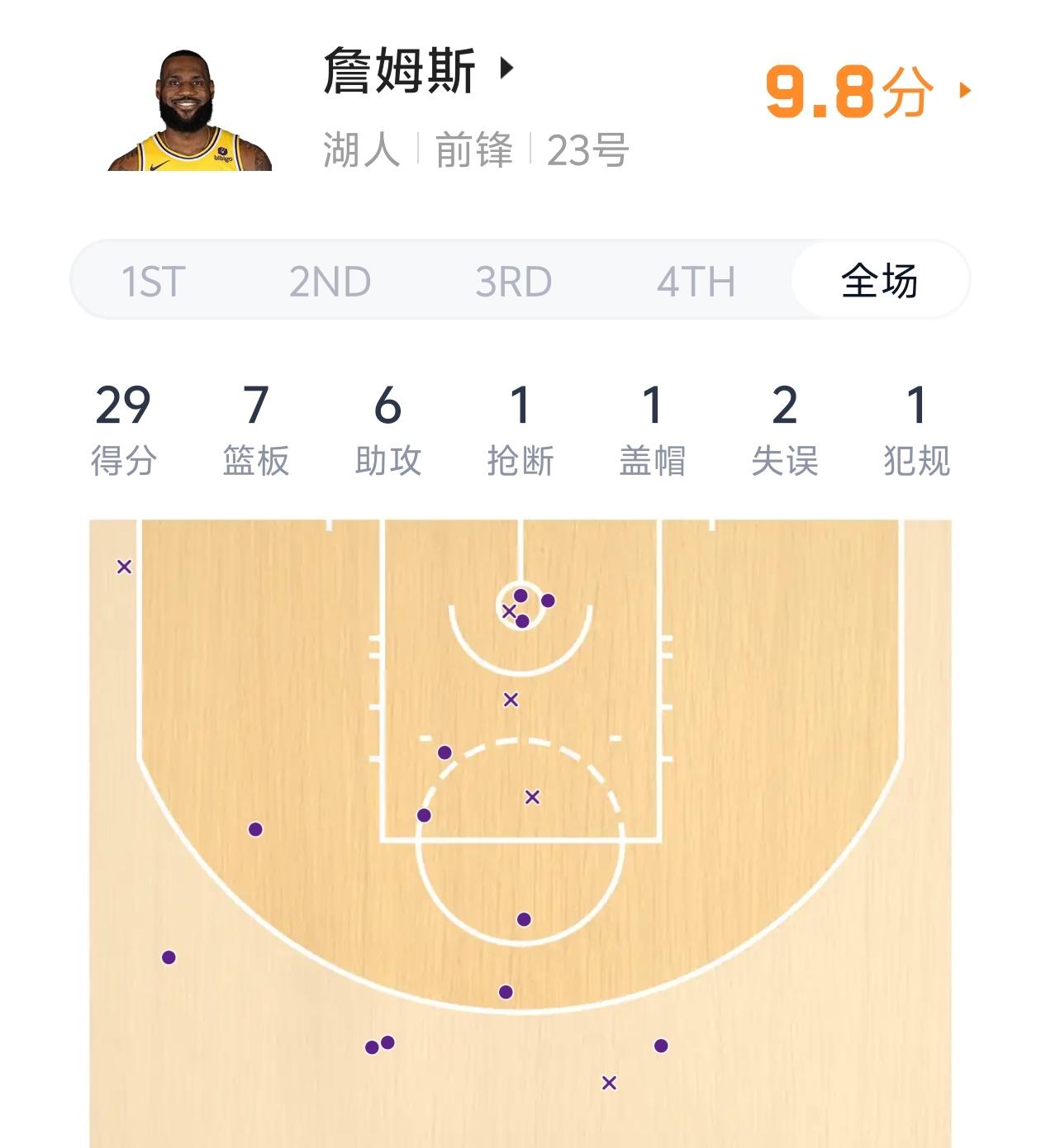 评分9.8!詹姆斯打出本赛季最佳表现! 詹姆斯在对阵76人比赛中打出了本赛季最佳表现,球迷在赛后也非常公正的给出了9.8的高分。 詹姆斯是湖人赢球的大功臣,他在末节发力独得12分3篮板3助攻1抢断,在攻防两端都有出色的表现,正因为他在最后时刻的爆发,湖人才赢得了比赛。 詹姆斯全场投篮17中12,其中三分球6中4,得到赛季新高的29分,外加7篮板6助攻1抢断1封盖,詹姆斯的进攻效率相比之前有大幅提升,同时他依旧非常全面!