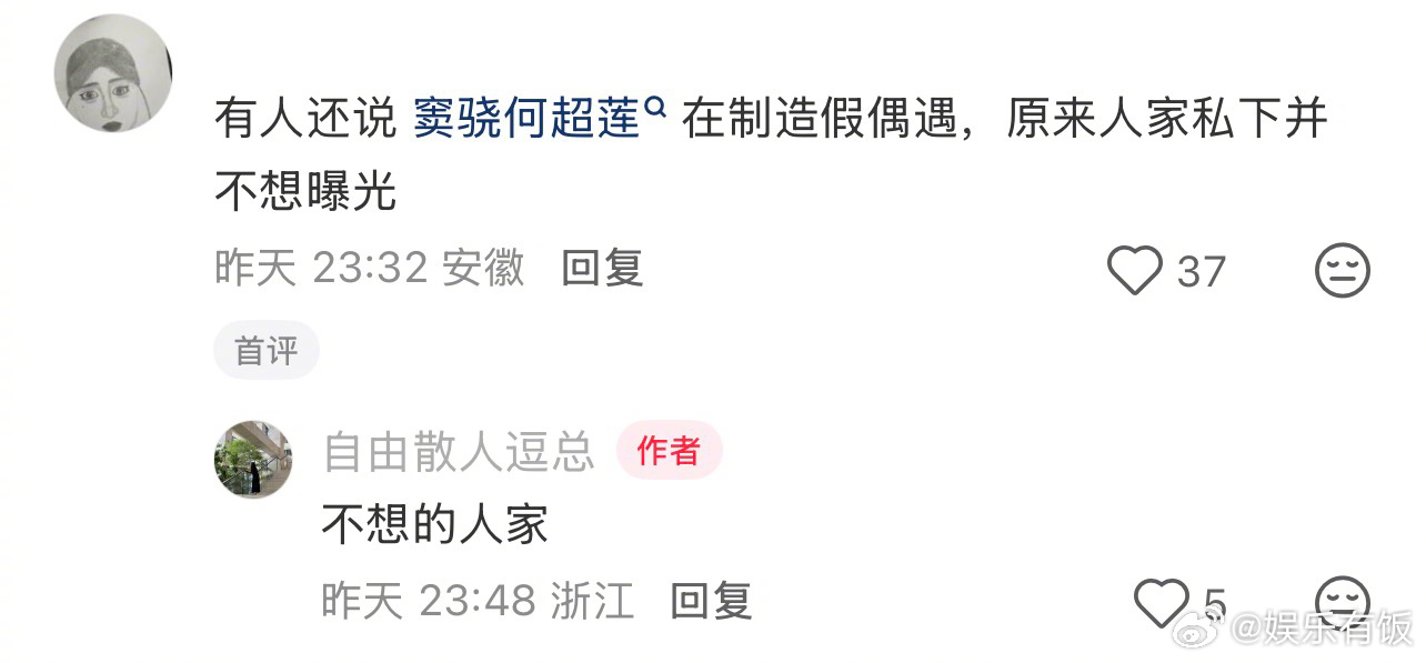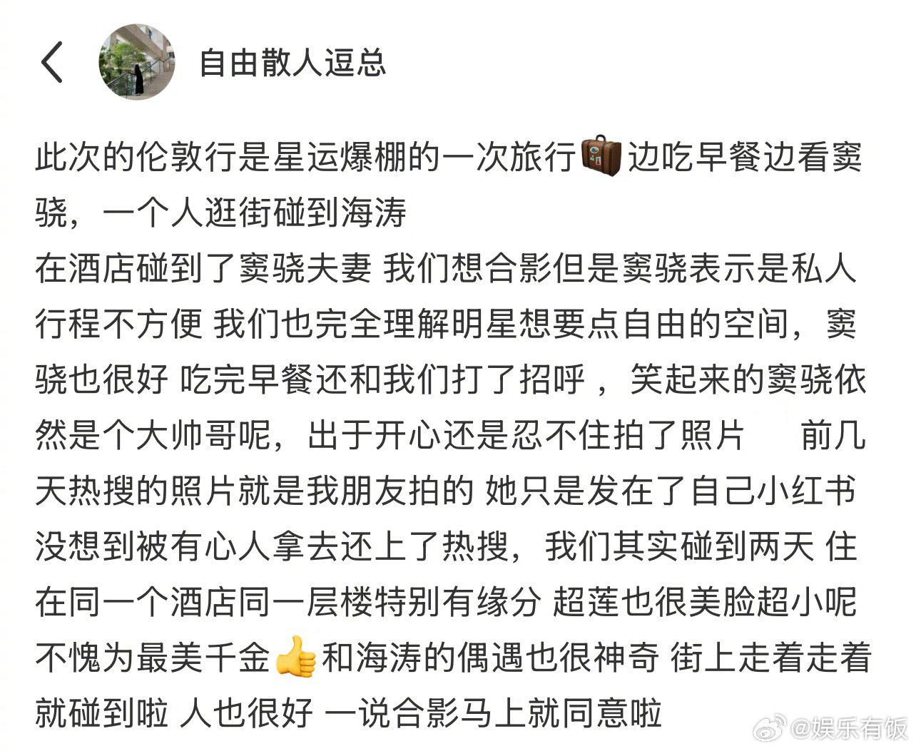 网友说窦骁何超莲不想曝光私生活偶遇窦骁何超莲一起吃早餐 7日,有网友分享伦敦行程奇遇:在当地餐厅吃早餐时偶遇窦骁,随后又在酒店碰到窦骁与何超莲夫妇,因对方表明是私人行程而主动放弃合影。该网友透露,窦骁私下态度亲和,用餐后主动打招呼;何超莲状态优雅,被赞“脸超小”。针对“假偶遇”的质疑,网友也澄清:窦骁夫妇明显倾向保护私生活,私下并无曝光意愿。