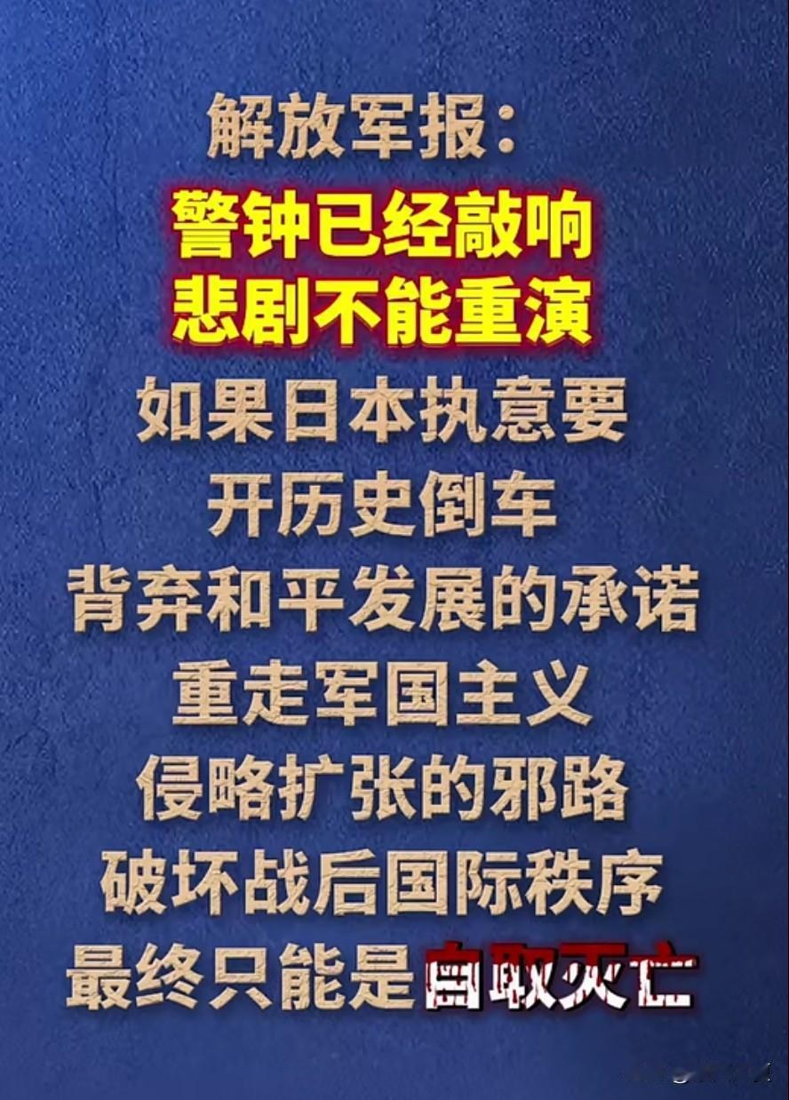 解放军报警告,别重演历史悲剧! 有些人还妄想“逆天改命”真是可笑,可悲!我们绝对是不会让历史重演的,我相信十四亿中华儿女,一定能挫败军国主义企图复活的决心。 大胆刁民,岂敢在太岁头上动土!我们从未忘记,也不敢忘记!如果来战,战火一定是在日本本土,我说的,不信你来试试!