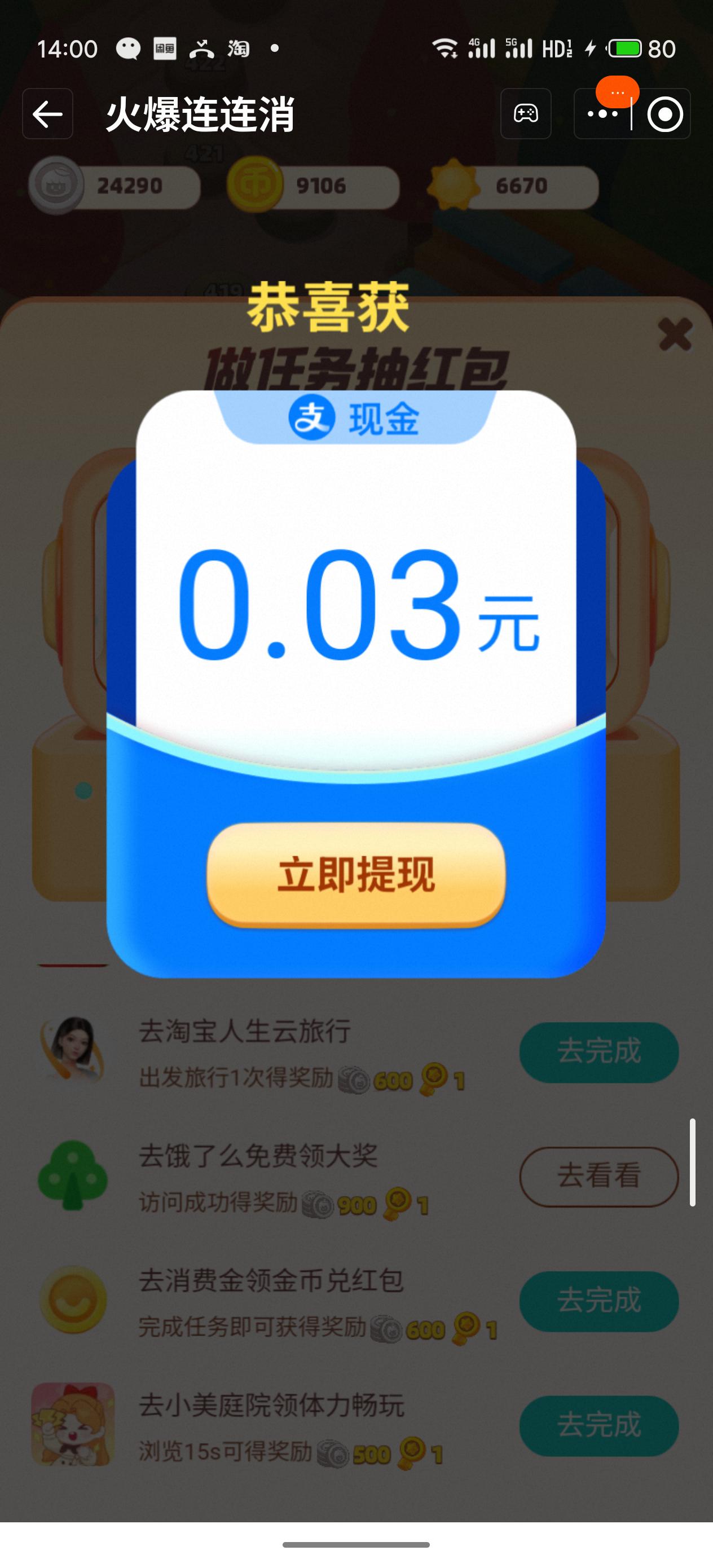 火爆连连消 在淘TB宝里进入游戏 挣消币里可以抽奖, 四次必中一次现金红包🧧 通过支ZFB付宝 会员积分里进入这个游戏也有一次现金红包🧧哦