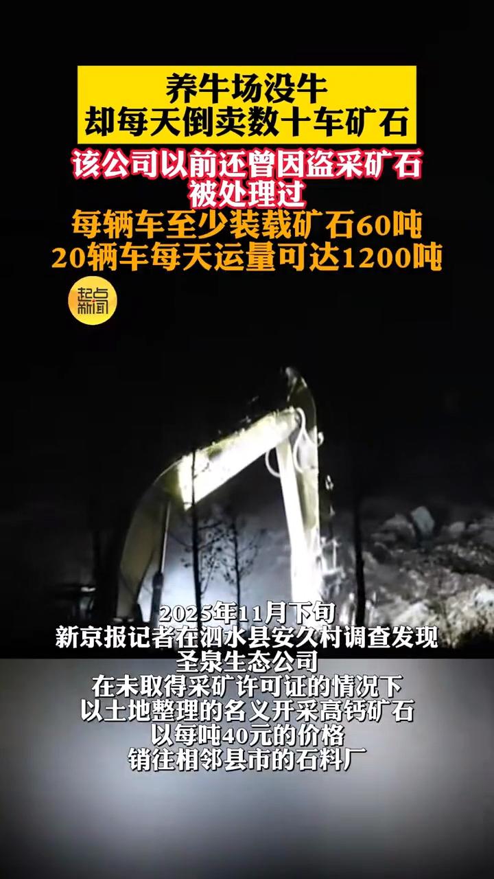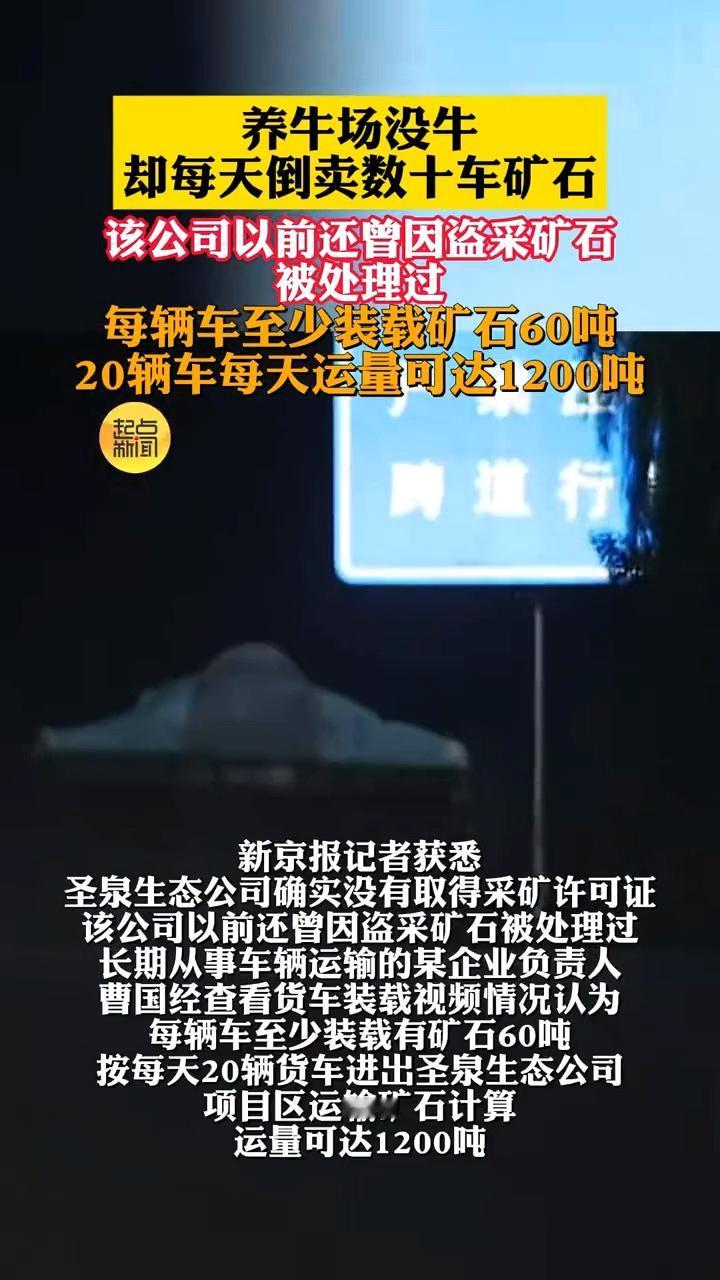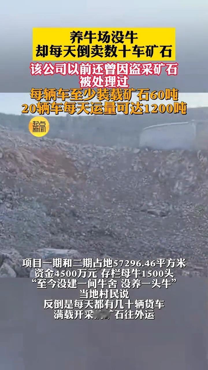 养牛场表面投资4500万,结果两年没养一头牛。倒是每天从养牛场拉走20车矿石,这不是挂羊头卖狗肉还是啥? 山东泗水县的一家养牛场,奇怪的很。立项两年多了,号称总投资将会高达4500万元。 结果两年过去了,一头牛都没见着。倒是养牛场每天都有几十辆大货车,拉着一车又一车矿石出去倒卖。 根据记者爆料,这些矿石,被以每吨40元的价格出售,一天20辆车,每辆车装60吨,也就是说,一天能卖1200吨,总计48000元。 这简直是日进斗金,难怪这家公司不如养牛转而去卖矿。 不过让人纳闷的是,这家公司也没有取得采矿许可证。 而且盗采矿石两年了,难道就没有其他人发现或者调查处理吗? 这件事很奇怪,得查!