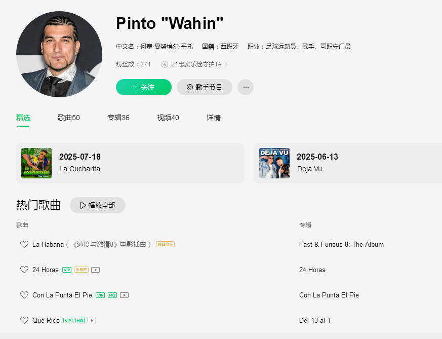 在QQ音乐听球员唱歌丨平托平托于2008年到2014年期间效力巴萨,退役后成为音乐人,这几年出专辑的速度还挺快。《速度与激情8》的配乐《La Habana》,就是出自平托之手。非常精彩的转型。足球冷知识