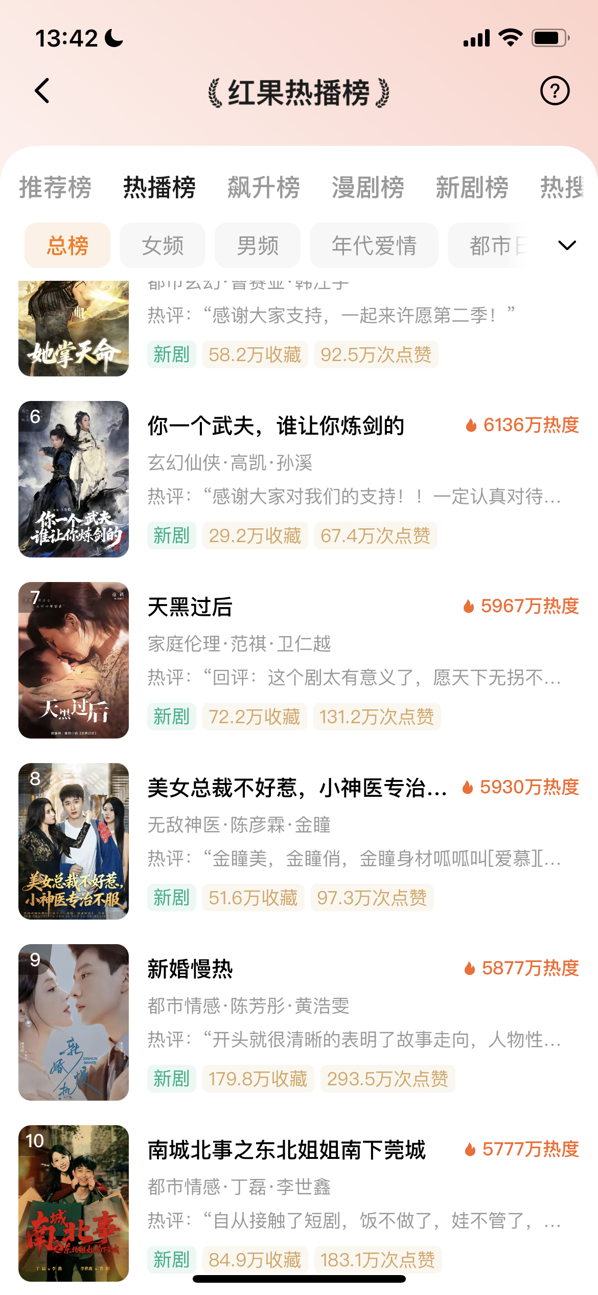 红果热播前十,四部纯男频爽剧三部大女主爽剧(不怎么谈情说爱)两部家庭伦理现实主义谈恋爱的女频,only one只有一部了
