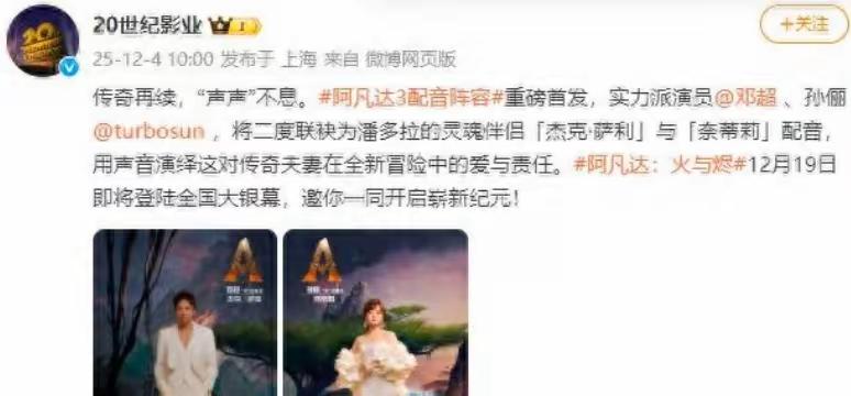 邓超孙俪官宣《阿凡达3》配音回归 实力打脸争议 邓超孙俪官宣原班人马为《阿凡达3:火与烬》中文配音,与黄轩、章子怡等携手,影片12月19日中美同步上映。夫妻俩演技与配音实力双在线,虽曾因高片酬、移民传言引争议,但深耕作品且坚持公益,用实力回应质疑,为娱乐圈树立正向榜样。 网友评论: 这不是他们的工作吗?为什么要官宣?是又要离还是又要结呀莫名其妙! 邓超孙俪是很优秀的演员做人做事都是很敬业很正直的人 片酬高和观众有何关系?难道片酬低票价就低吗? 他俩可评为广告夫妻第一。 孙俪自己演的女主戏都需要人来为她配音,她去做配音了,那么配音演员给谁配音 邓超 孙俪