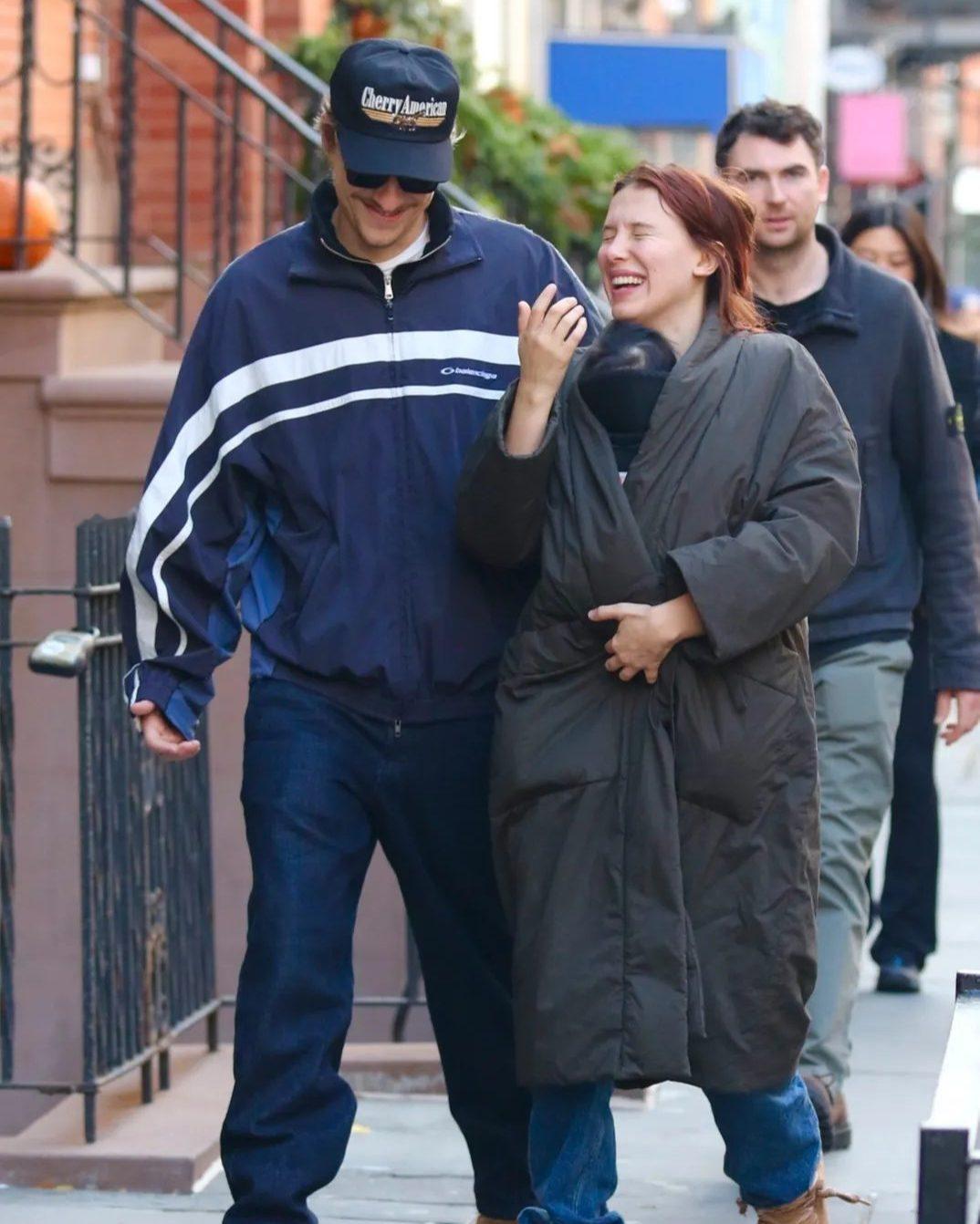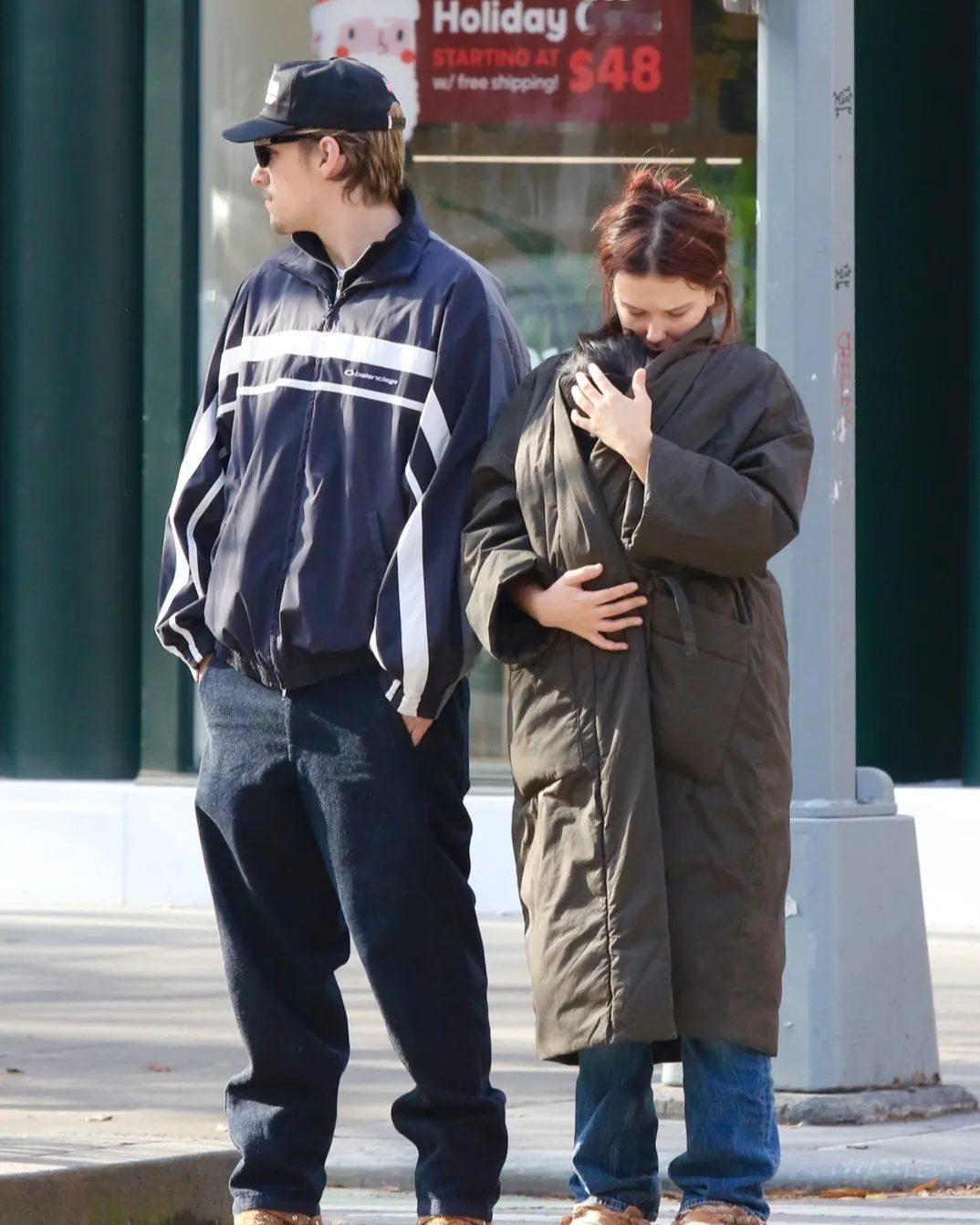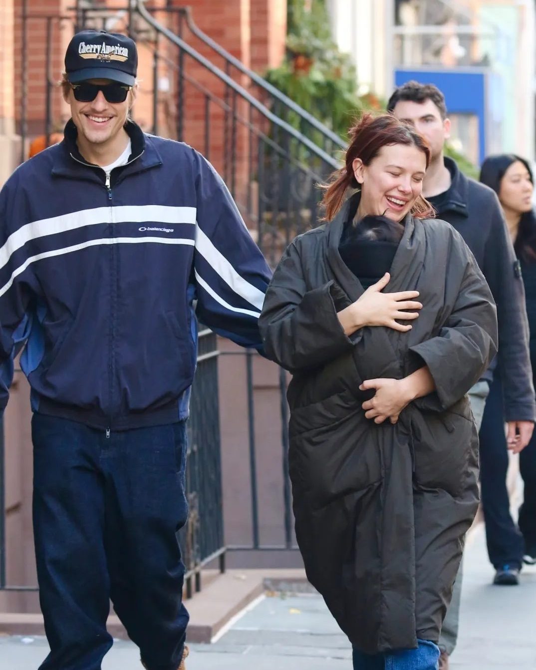 《怪奇物语》“小11”米莉·波比·布朗一家三口纽约新街拍,升级为新手妈妈的米莉用自己的大外套裹住抱在怀里的宝宝,画面十分幸福温馨。