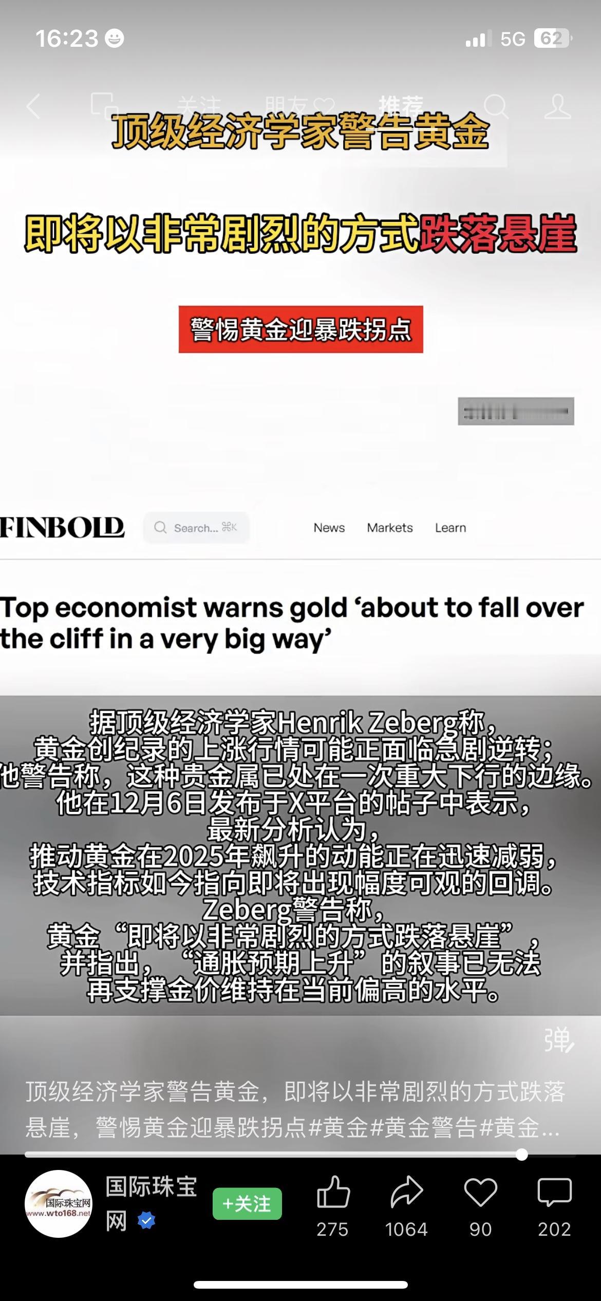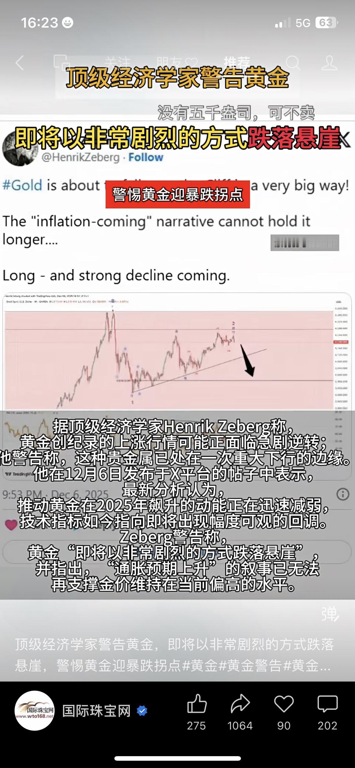 经济学家预警黄金大跌,这逻辑真的靠谱吗? 近期有顶级经济学家警告黄金要“剧烈跌落悬崖”据凤凰网12月8日报道理,由是通胀预期撑不住当前高价,技术面也显动能不足。但当下金价还在4200美元/盎司高位,这说法到底能不能信? 小众角度:这只是单一专家观点,反观世界黄金协会、瑞银、高盛等机构都看涨2026年金价,甚至预测能涨到4900美元,多空分歧大,不能单靠一种声音下判断。 实用信息1:持有黄金资产不用慌,重点盯美联储降息动向和地缘局势,这俩是当前影响金价的核心,降息预期强、风险升级大概率会托举金价。 实用信息2:短期金价可能有技术性回调波动,但央行持续购金、避险需求没减,长期支撑还在,不用盲目跟风调整资产。 你现在会调整手里的黄金资产吗? 以上内容核心事实均来自公开权威信息,仅供参考,具体可以官方最新通报为准;个人解读仅代表客观分析,不构成任何引导,理性看待热点更重要。黄金价值分析 黄金分析 黄金未来的走势 黄金后市分析