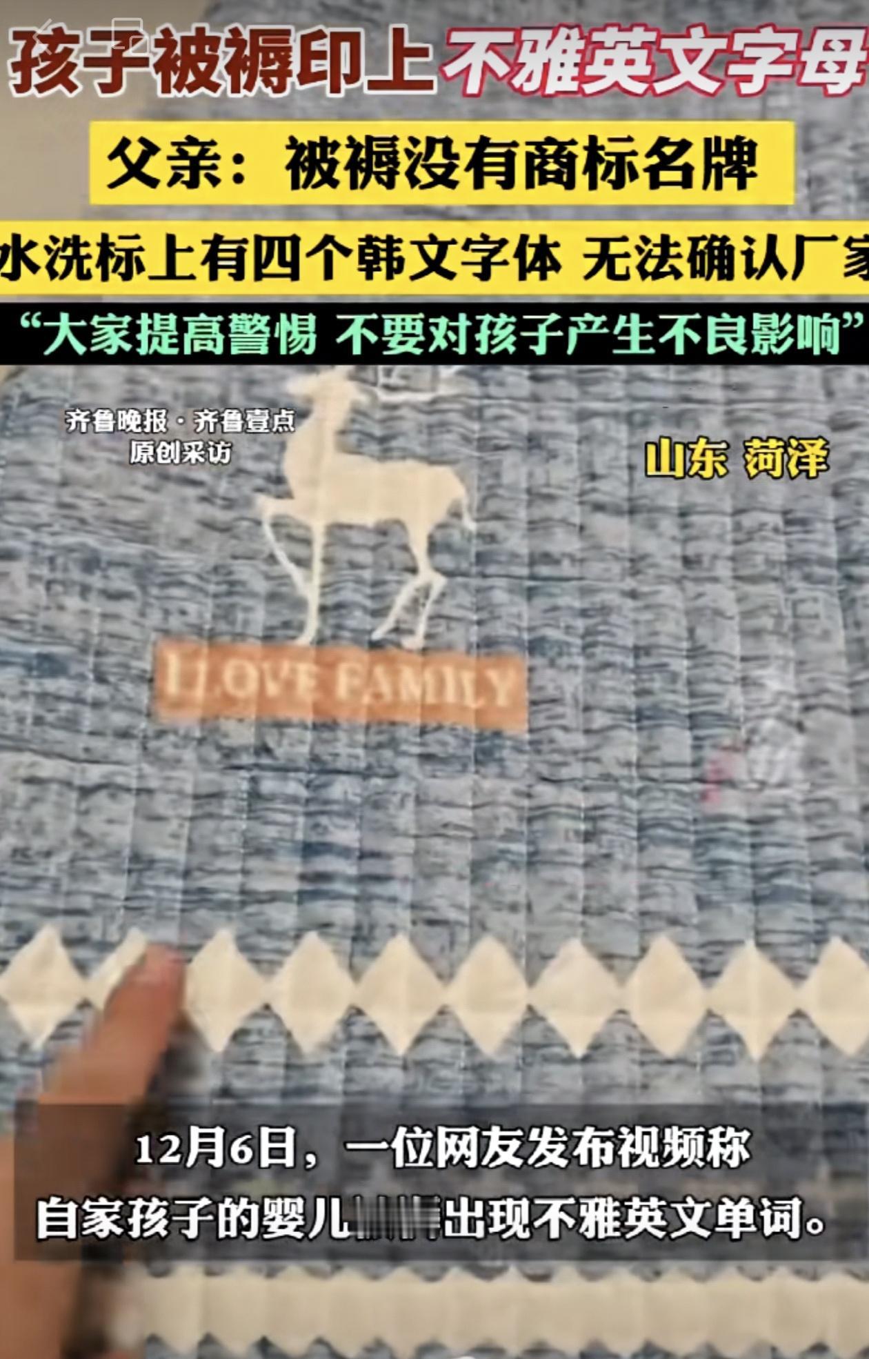 年轻女孩,性… 家长发现孩童被褥背面居然藏着“SEX”这种不雅英文? 山东菏泽这位家长一掀开被子直接懵了:正面是可爱图案,背面悄咪咪印着“Young girl is very beautily or SEX wintery swim”,这哪是儿童用品,分明是藏着脏东西的“毒包装”! 更气人的是,这被褥没商标没名牌,就水洗标上四个韩文,连厂家都找不到。家长发出来不是想追责,是怕更多孩子碰到这种糟心东西——咱给娃买贴身用的,谁能想到得“正反面+中英文”全查一遍啊? 儿童用品的审核能不能长点心?别让这些藏污纳垢的玩意儿,偷偷凑到孩子身边! 文化入侵一刻没有停,一些藏在阴暗角落里的害虫必须重拳扼杀!