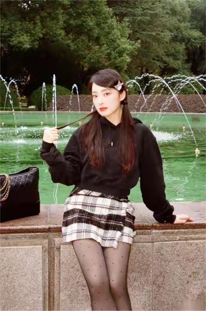 绿意盎然的公园里,少女与喷泉相伴,享受宁静时光。