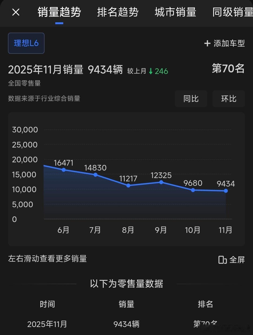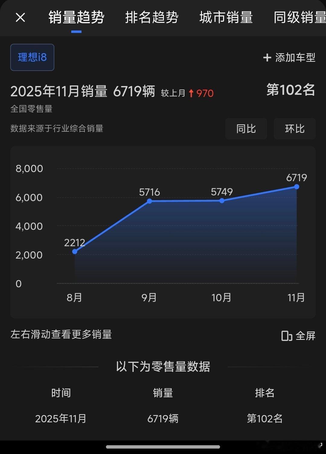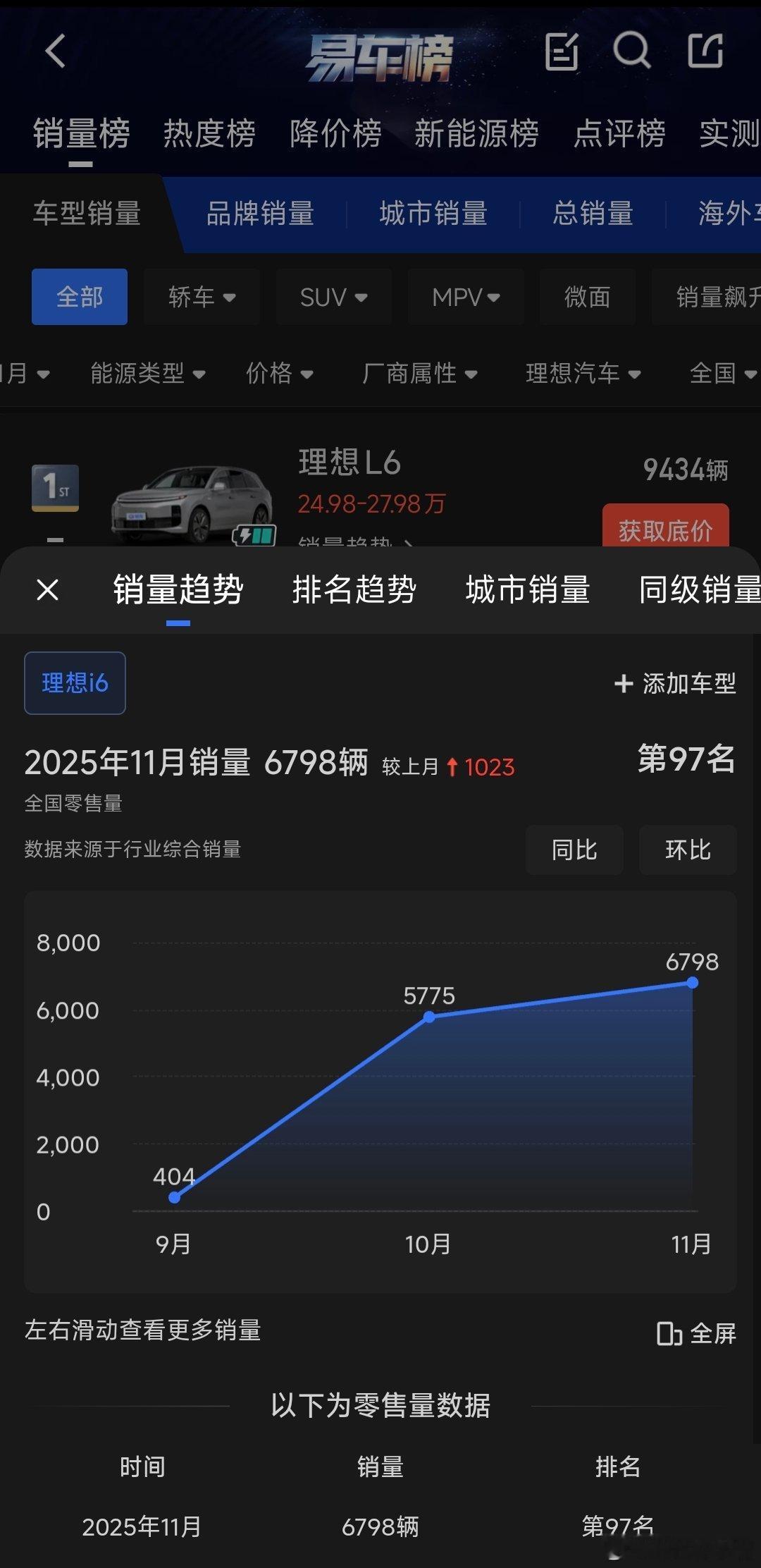再来看看理想11月情况:1、理想L6依然是品牌销量扛把子,单一车型虽然没破万,但维持在月销9k+;2、理想i6与理想i8比上个月还有微涨,我觉得尤其是理想i8,还没去看车试驾的朋友,记得去看看;这对于理想继续推动纯电站建设以及下一代增程产品迭代,我觉得是有帮助的,后顾之忧进一步减少,应该不会在既要又要中陷入过多纠结。新能源汽车理想汽车