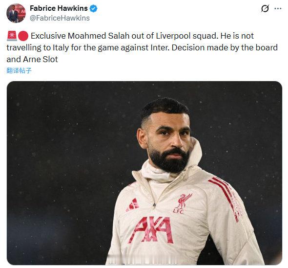 【萨拉赫被踢出欧冠名单】法国名记Fabrice Hawkins独家消息:萨拉赫已经被利物浦踢出欧冠比赛大名单,他将不会随队前往意大利,不会出战作客国际米兰的欧冠比赛,这个决定是由俱乐部董事会与主帅斯洛特共同作出。