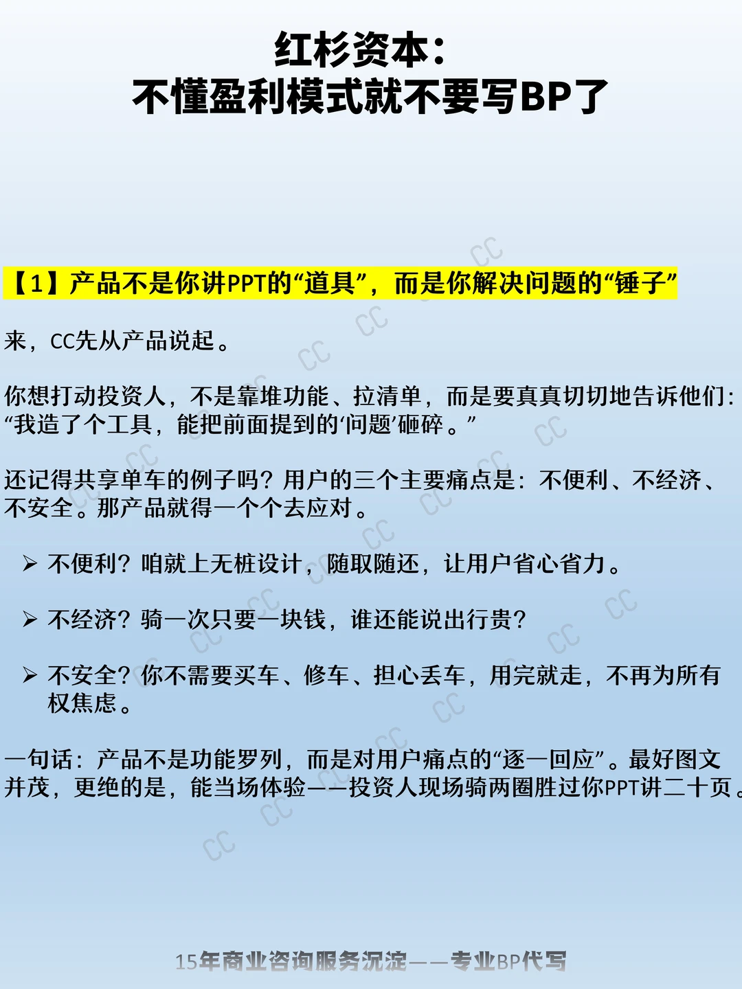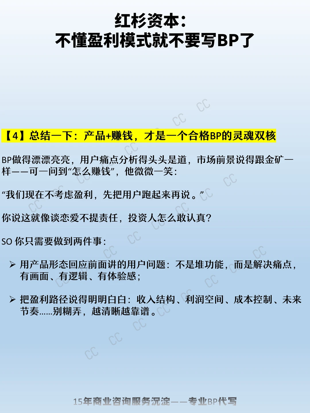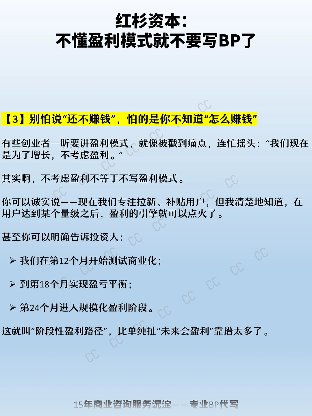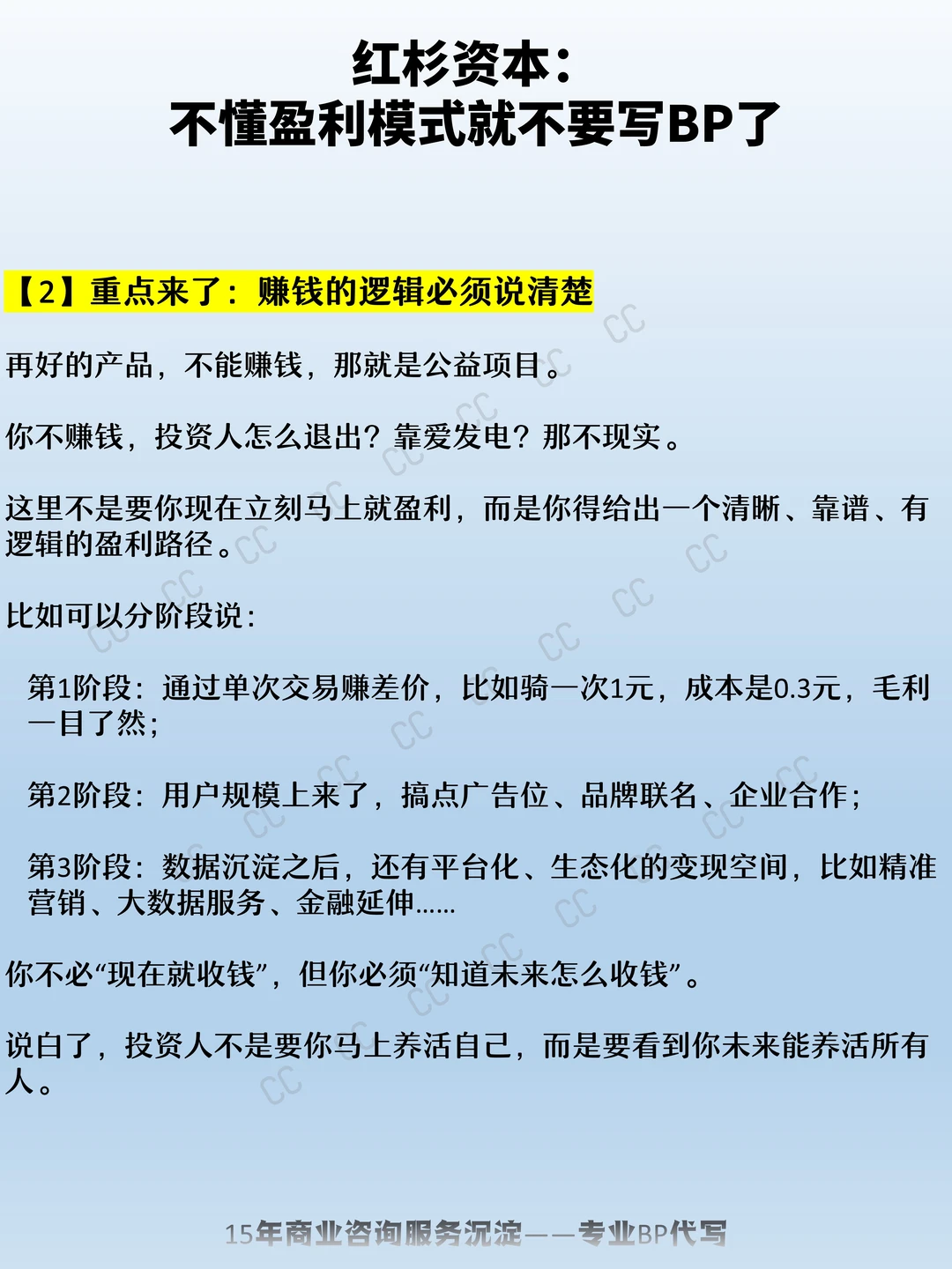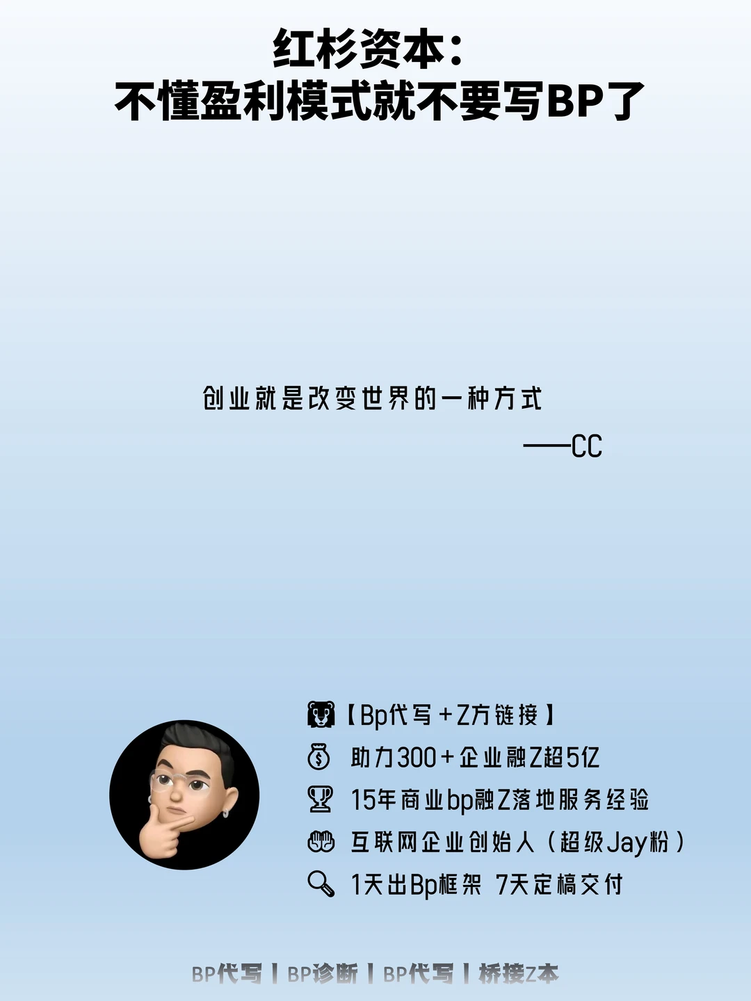 哈喽 我是你们的好朋友CC啊 服务300+项目BP策划 发现大部分朋友的BP做得漂漂亮亮,用户痛点分析得头头是道,市场前景说得跟金矿一样 可Z方一问到“怎么赚钱”,他微微一笑: “我们现在不考虑盈利,先把用户跑起来再说。” 你说这就像谈恋爱不提责任,投资人怎么敢认真? 很多时候BP就像一部电影,只讲前情提要和英雄人设,却不告诉观众最终结局和票房预期。 但投Z人不是文艺青年,他们是出品人,是要拿回报的。 创业 商业模式 商业计划书 财务分析 盈利模式