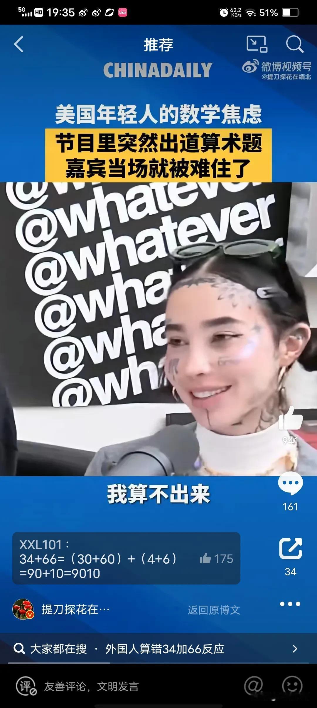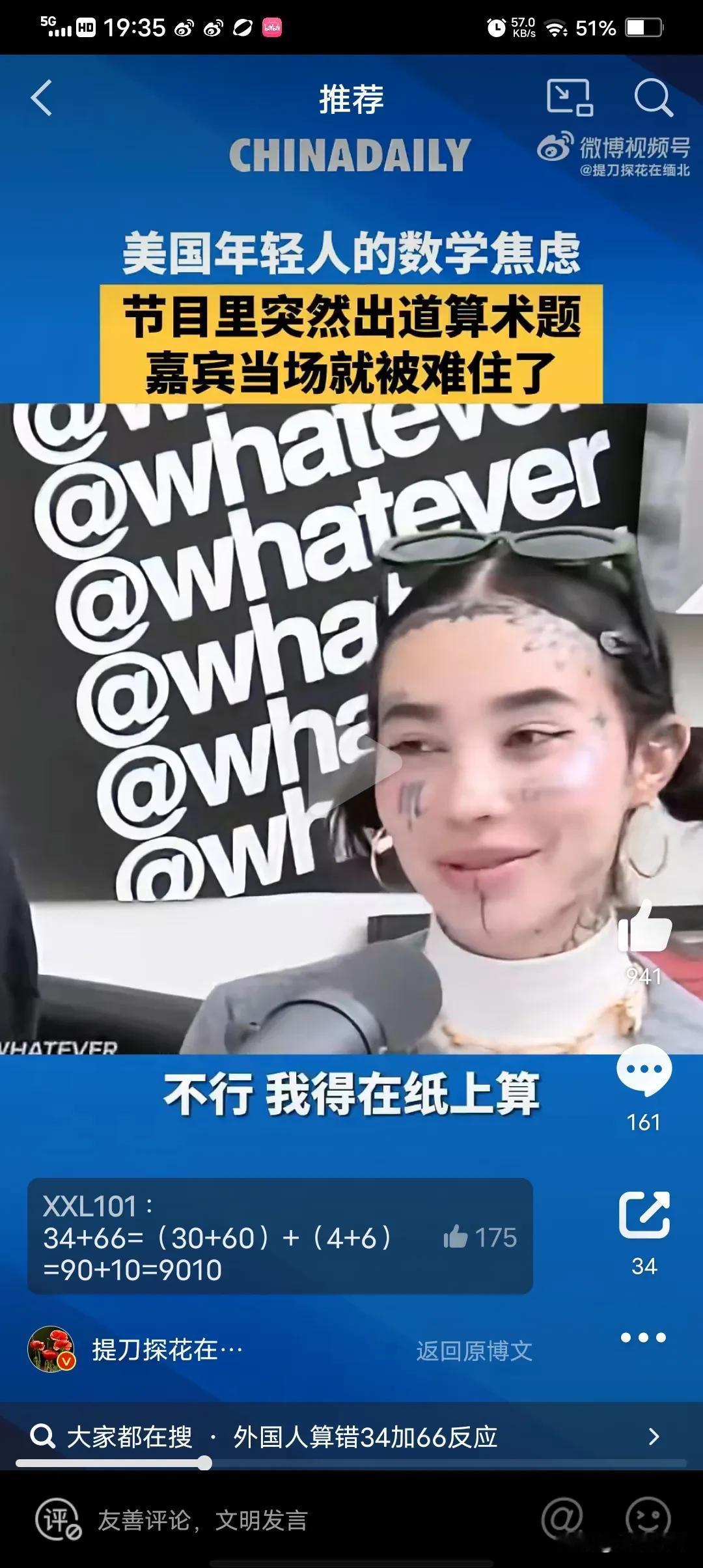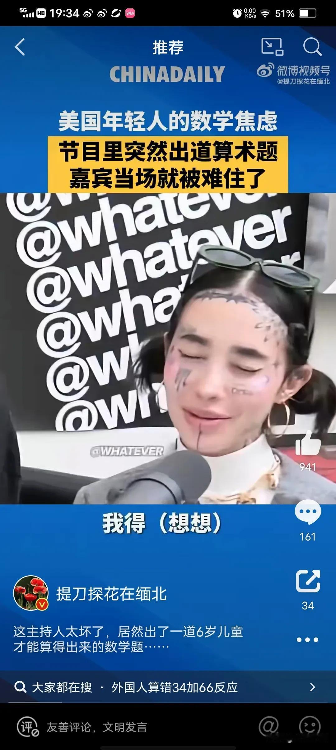美国的快乐教育多夸张,34加66等于多少,居然难倒整个节目的人,在一个美国的节目中,应该是在讨论教育的问题,主持人问了几个中学的女孩,34加66等于多少,这种学前班就应该会数学题,估计我们这边连没有上过学的长辈都能秒算出来的数学题,结果几个美国女孩全都算不出来,还要求说能不能给支笔和给张纸,它们要手动算一下,主持人说不行,只能口算,最后没有一个人算出来,主持人说算不出来,节目就不要再进行了,估计是被气到了! 前两天看到一个消息,在美国排名前十五的常青藤大学加州大学圣地亚哥分校有12%的学生不具备初中数学水平,刚开始我还不太相信,现在我真的信了,快乐教育正在反噬美国的大学教育!