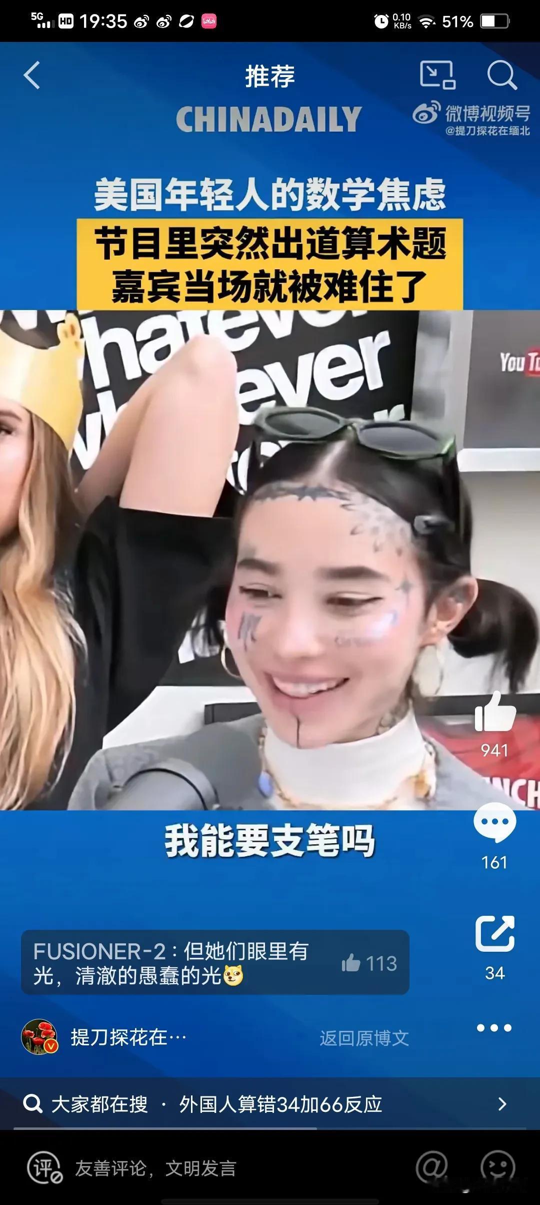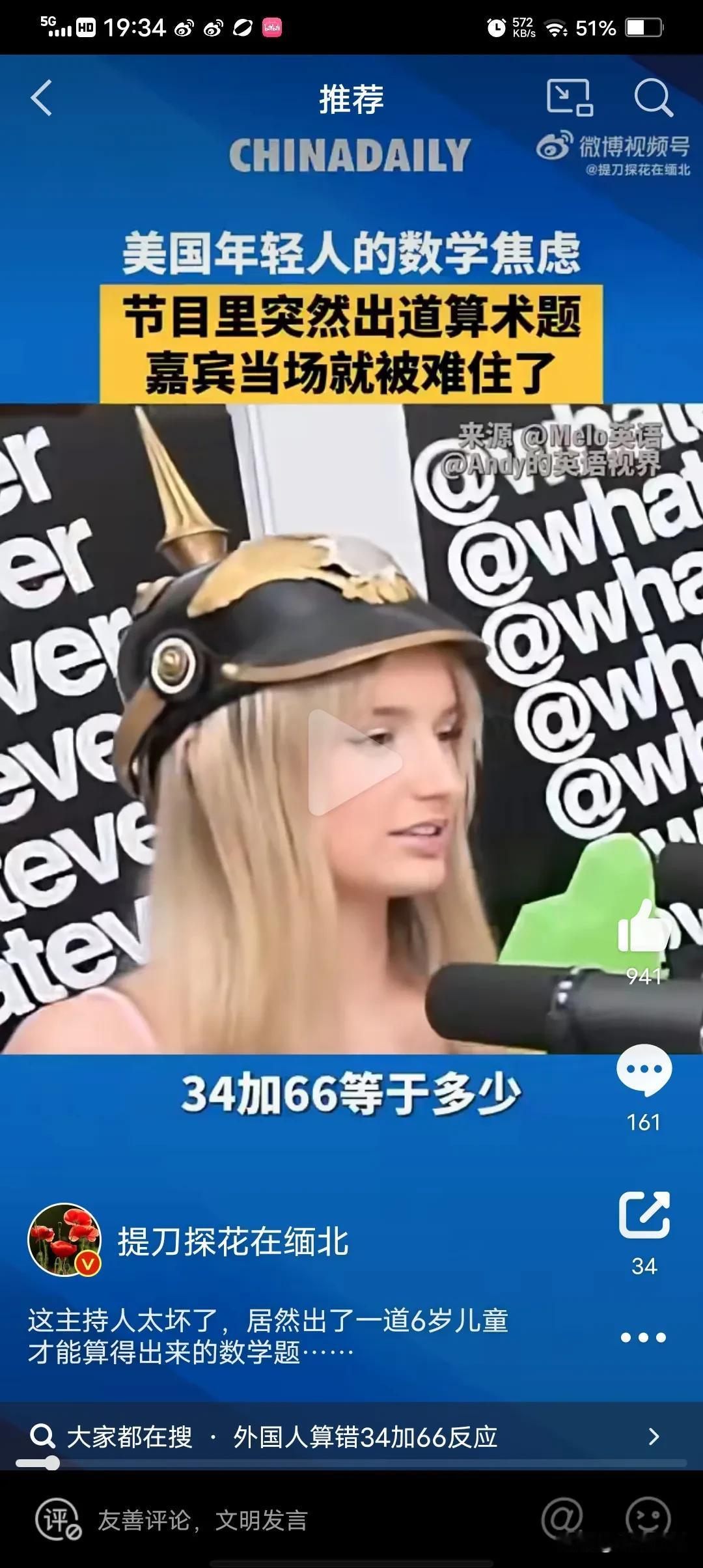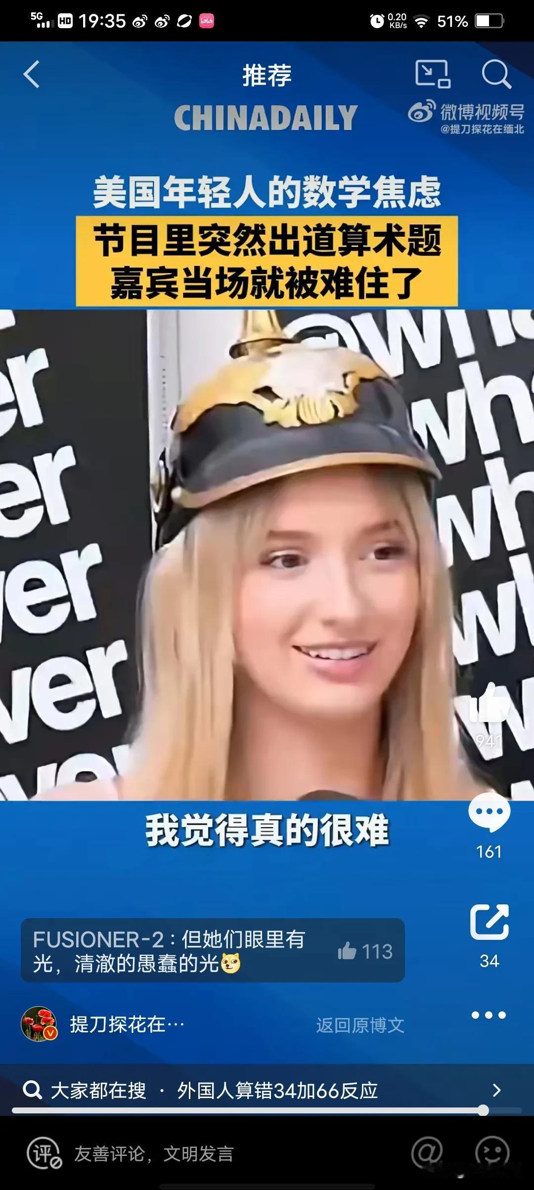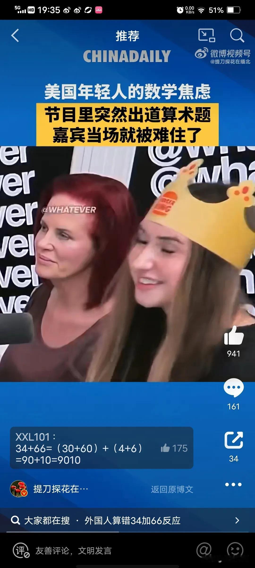 美国的快乐教育多夸张,34加66等于多少,居然难倒整个节目的人,在一个美国的节目中,应该是在讨论教育的问题,主持人问了几个中学的女孩,34加66等于多少,这种学前班就应该会数学题,估计我们这边连没有上过学的长辈都能秒算出来的数学题,结果几个美国女孩全都算不出来,还要求说能不能给支笔和给张纸,它们要手动算一下,主持人说不行,只能口算,最后没有一个人算出来,主持人说算不出来,节目就不要再进行了,估计是被气到了! 前两天看到一个消息,在美国排名前十五的常青藤大学加州大学圣地亚哥分校有12%的学生不具备初中数学水平,刚开始我还不太相信,现在我真的信了,快乐教育正在反噬美国的大学教育!