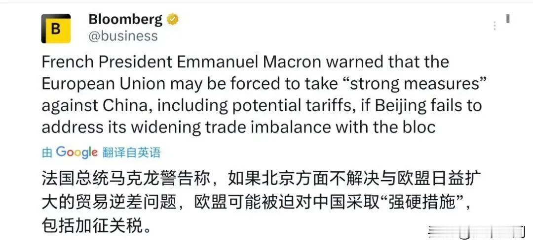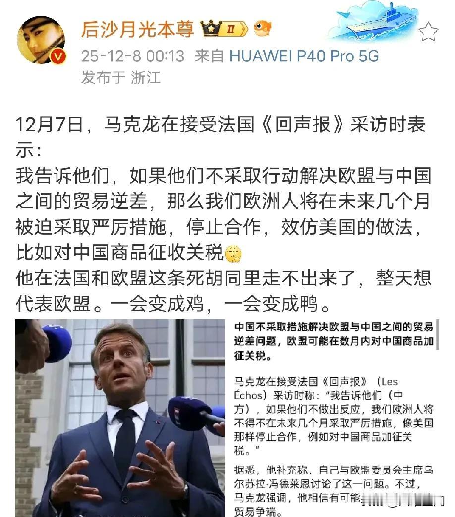 马克龙刚回去就变脸了,称它在中国的时候,已经要求中国解决和欧洲的贸易逆差,要不然未来几个月,欧洲可能会采取跟美国一样的措施,加征关税,或者停止合作! 变色龙就是变色龙,跟上次一样,在我们这边谈得好好的,一回去就变脸了,我觉得马克龙基本也快下台了,根本不需要有太多期待,如果未来几个月欧盟真的效仿川普加关税,那马克龙来签的那些订单就通通取消了,欧洲政客根本就没有一个正常的,脑子里充满了傲慢和偏见,已经快变成破落户了,还以为自己是占据道德制高点的圣母!