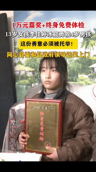 13岁李佳婷冰窟救人后续:获1万奖金与终身体检,这才是“英雄应有的待遇” 当同心县领导将装有1万元的信封和印着“终身免费体检”的凭证交到李佳婷手中时,这姑娘紧握着荣誉牌匾的手不住颤抖——并非为钱所动,而是那冻得发红的指尖终于有了依靠。 13岁的她踩破冰面,义无反顾地扑向落水男童时,从未想过“回报”:棉衣湿透如铁,指甲嵌进冰碴,就连哭泣也是事后在消防车里默默无声——然而,这世间的善意,从不会让英雄心寒。 终身免费体检,守护的是她未来岁月的安宁。这不仅是给李佳婷吃下的“定心丸”,更是给所有普通人注入的“强心剂”:你的挺身而出,绝不会被辜负,你的善良勇敢,自有社会保障。 如今,她在校园里成了“小榜样”,街头巷尾都在称赞“这姑娘真了不起”。这份双向奔赴的温暖,早已比奖金更为珍贵——原来英雄从不孤单奋战,你为世界增添一分温暖,世界便会回馈你万分甜蜜。 李佳婷冰窟救人 社会百态 你对人生有哪些感悟