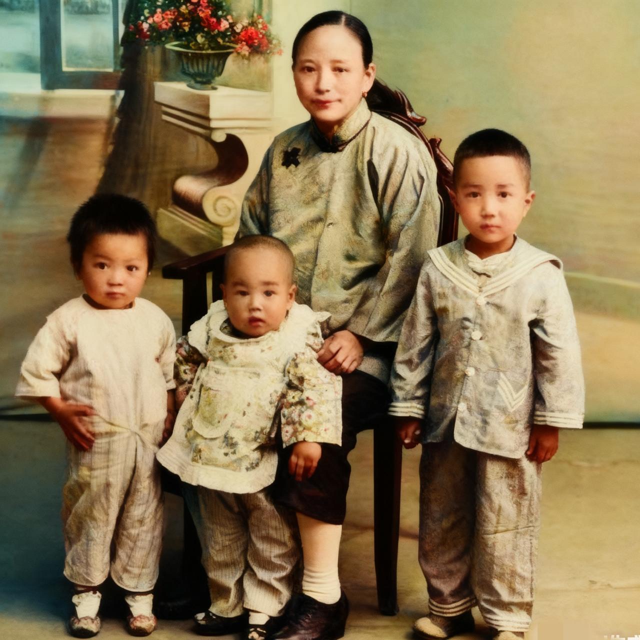胡适的三个孩子与母亲江冬秀,一张罕见合影,孩子们亲昵地偎依在江冬秀身旁,画面满是