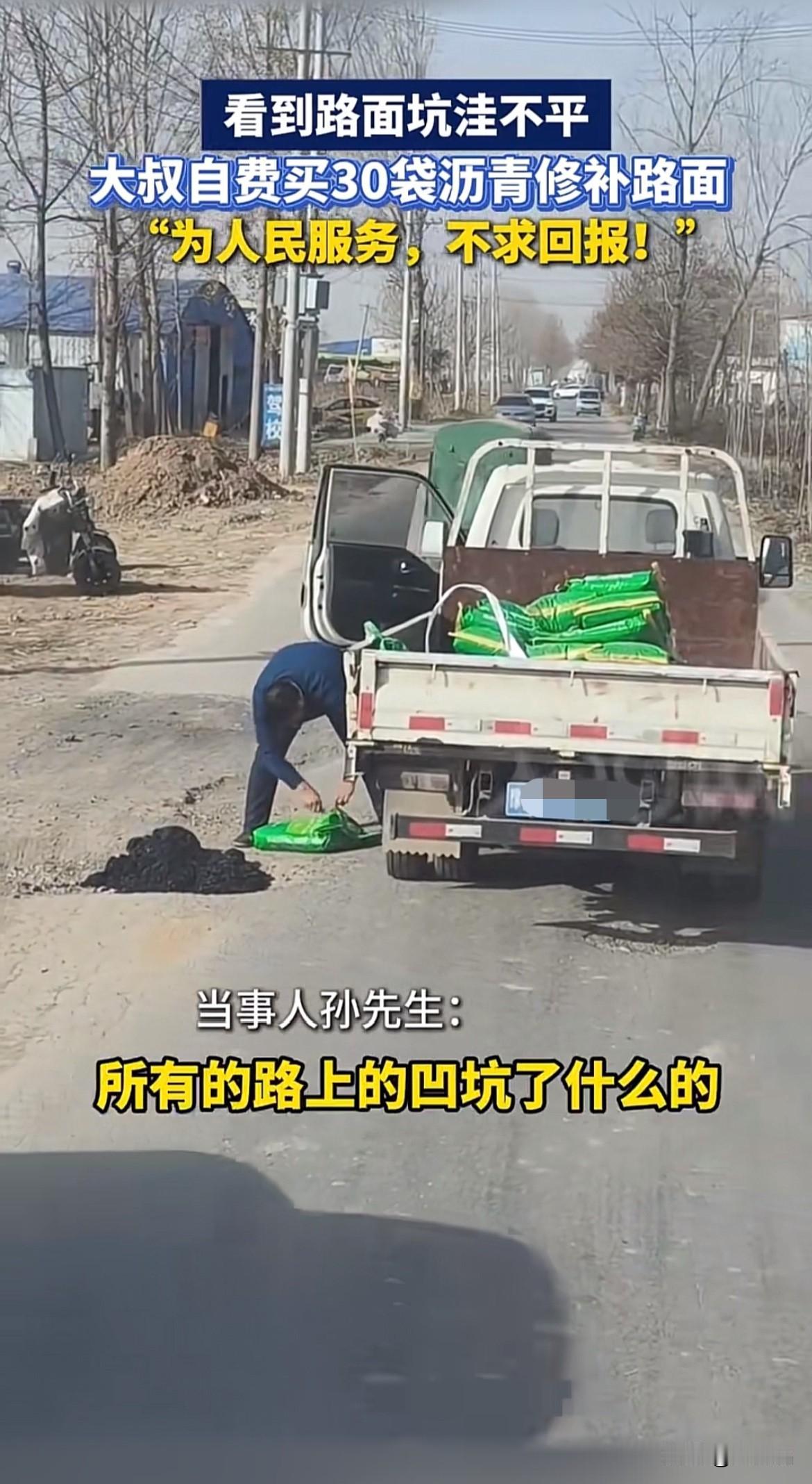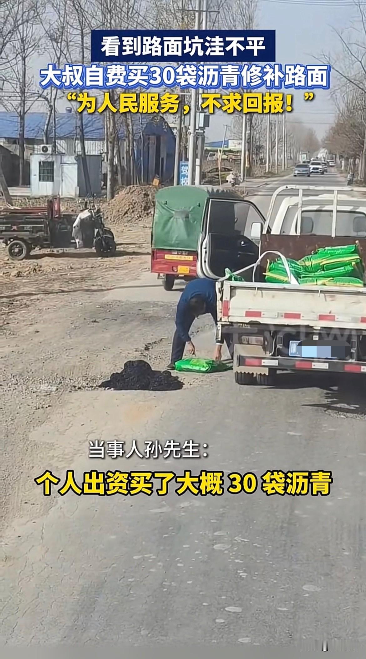 河南许昌,大叔看到路面坑坑洼洼,自费买30袋沥青修路,网友的讨论让人引发深思。 乡道路面坑坑洼洼,过路不方便,大叔看到后,自费出资买来了30袋沥青,自行修路。大叔说:“为人民服务,不求回报。” 没想到大叔的善意之举只有少部分人称赞,很多的网友都在指责,或者是调侃。 网友说大叔做好人好事,但修路的时候要做施工提醒,提醒大叔注意安全。 也有网友说,大叔这种修法纯属浪费钱,没有清理干净碎石,直接铺沥青,路面会分层,下一次雨就废了。 还有网友指责大叔这种私自修路的行为违法,没有合规资质,道路质量没有保障。 更有网友调侃政府不作为,这些道路失修装看不见;调侃大叔挡了某些部门的财路,暗讽政府修路工程利益输送。 大叔只一心为人民服务,修好路,做好事,没有那些弯弯绕绕的心思,出发点是好的,值得赞扬。但施工安全、道路质量安全问题网友说得也在理,以免好心办坏事,大叔可以向有关部门反馈,并监督执行,便利他人的同时,也保护好自己。