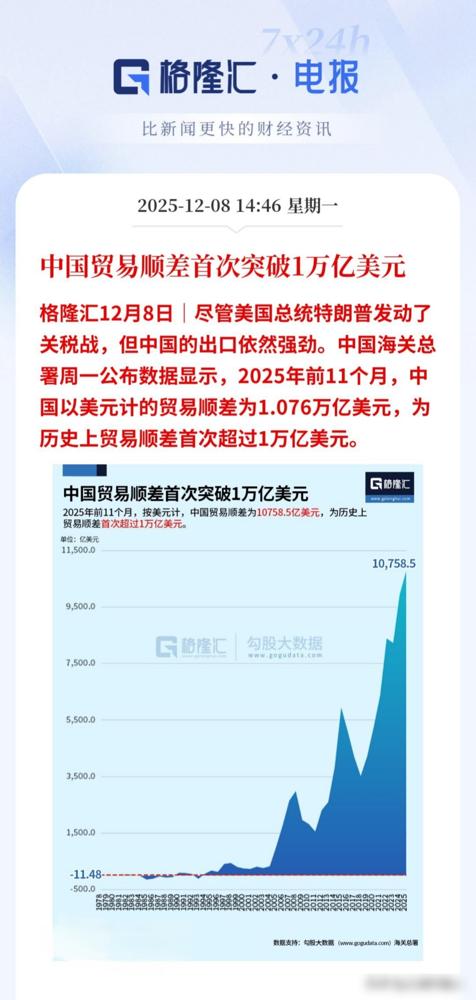 外贸大超预期!值得庆祝[赞][赞] 海关总署:前11个月中国贸易顺差以1.076万亿美元! 这个数字确实提气。破万亿美元,是个里程碑。 但高兴之余,也得看看这钱是怎么赚的,里面藏着什么隐忧。 光看顺差总额容易上头。得拆开看结构。 顺差主要来自哪里?很大一部分还是对美顺差。 这就有点意思了。美国一边加关税,一边还得大量买中国货。 说明什么?我们的产业链优势是实打实的。不是几轮关税就能轻易替代的。 东南亚一些国家想承接转移,但完整的工业体系不是一朝一夕能建成的。 我们的韧性就在这里。 不过,也不能太乐观。传统优势产品,比如家电、纺织品,竞争越来越激烈。 利润空间被压得厉害。很多时候是薄利多销,赚个辛苦钱。 再看进口,大宗商品价格涨得厉害。原油、铁矿砂这些,花出去的外汇也不少。 相当于我们出口很多件衣服玩具,才能换回来一船油。 这提醒我们,产业升级太重要了。 高附加值的产品,比如新能源汽车、光伏产品,这两年出口势头很猛。 这才是未来的方向。不能总停留在产业链的中低端。 外部环境也越来越复杂。除了关税,各种贸易壁垒也多了起来。 一些国家动不动就搞反倾销调查。 我们不能只埋头生产,也得抬头看路。积极应对这些挑战。 破万亿美元当然是实力的体现。 但真正的强大,是让增长更有质量,让发展更可持续。 老百姓能从中得到更多实惠,才是硬道理。